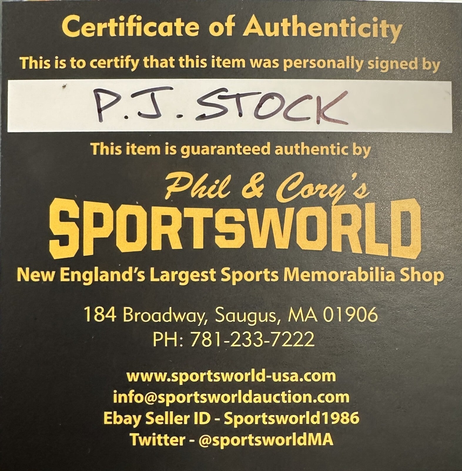 We're offering this Boston Bruins Hockey Puck Autographed by All-Time Great Tough Guy P.J. Stock. It's in nm condition and it comes with a COA Issued by Sportsworld, New England's Largest Sports Memorabilia Shop and his signature is guaranteed to be 100% authentic. It will be shipped in a plastic display Square and, we will combine on shipping for similar items.