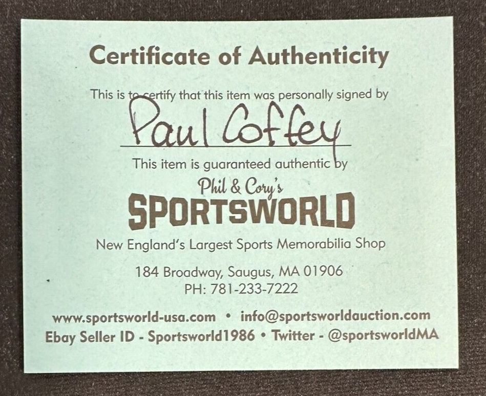 We're offering Boston Bruins 100th Anniversary Hockey Puck Autographed by Bruins Star Paul Coffey. It's in perfect condition and it comes with a COA Issued by Sportsworld New England's Largest Sports Memorabilia Store and his signature is guaranteed to be 100% authentic. We do have multiples so the puck you receive might not be the exact puck in the photo. It will be shipped in a plastic display square.