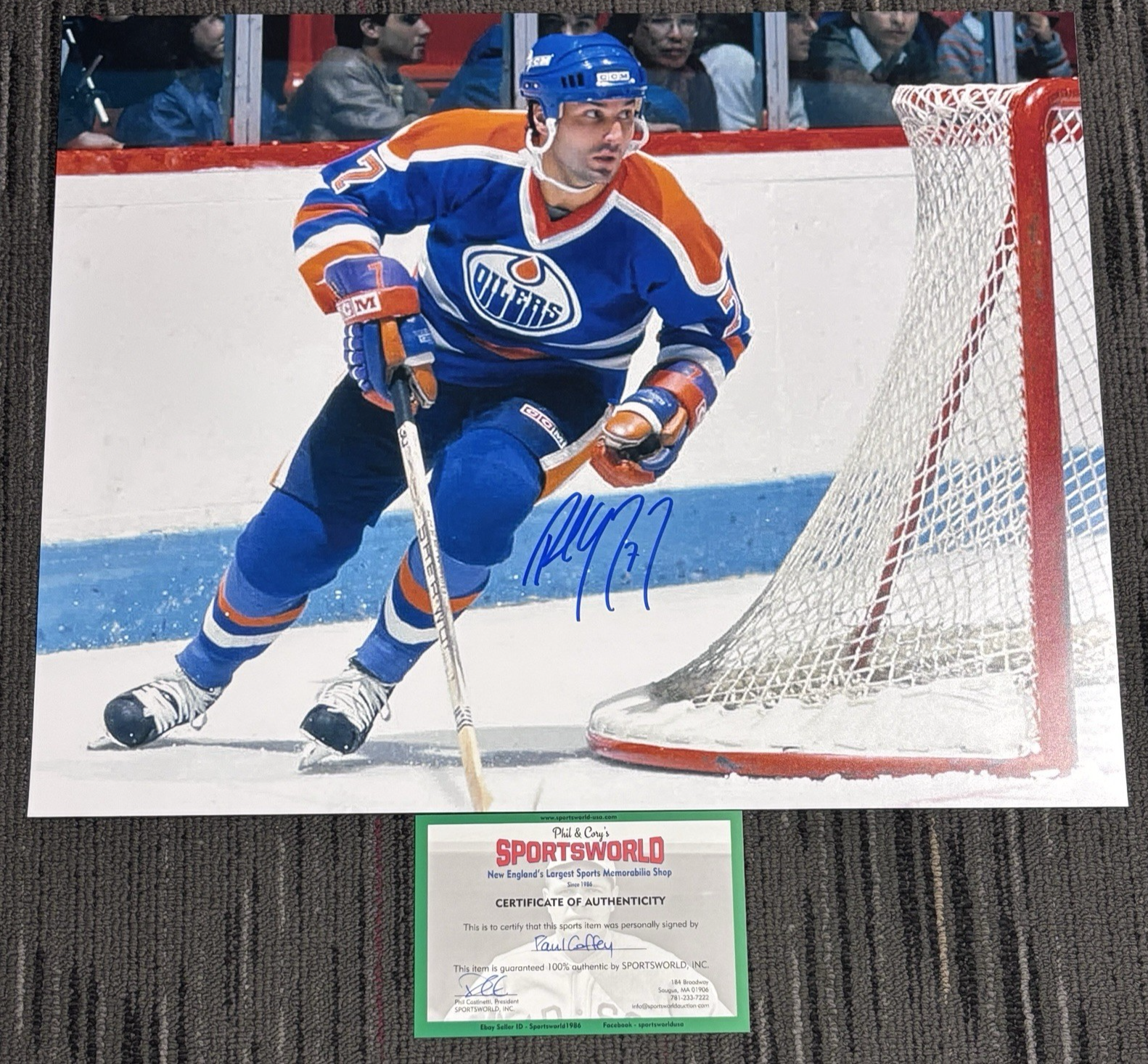 We're offering this 16x20 Photo Autographed by Hockey Hall of Famer Paul Coffey of the Edmonton Oilers. It comes with a COA issued by Sportsworld New England's Largest Sports Memorabilia Store and his signature is guaranteed to be 100% authentic. The photo is in nm condition, and we will combine on shipping for similar items!