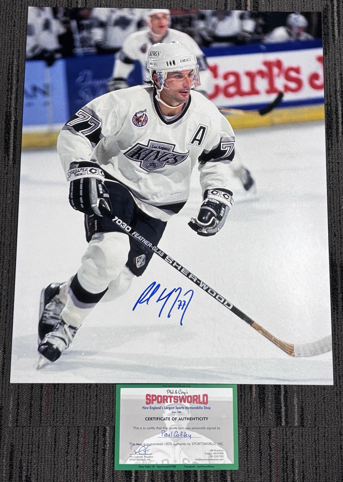 We're offering this 16x20 Photo Autographed by Hockey Hall of Famer Paul Coffey of the Los Angeles Kings. It comes with a COA issued by Sportsworld New England's Largest Sports Memorabilia Store and his signature is guaranteed to be 100% authentic. The photo is in nm condition, and we will combine on shipping for similar items!