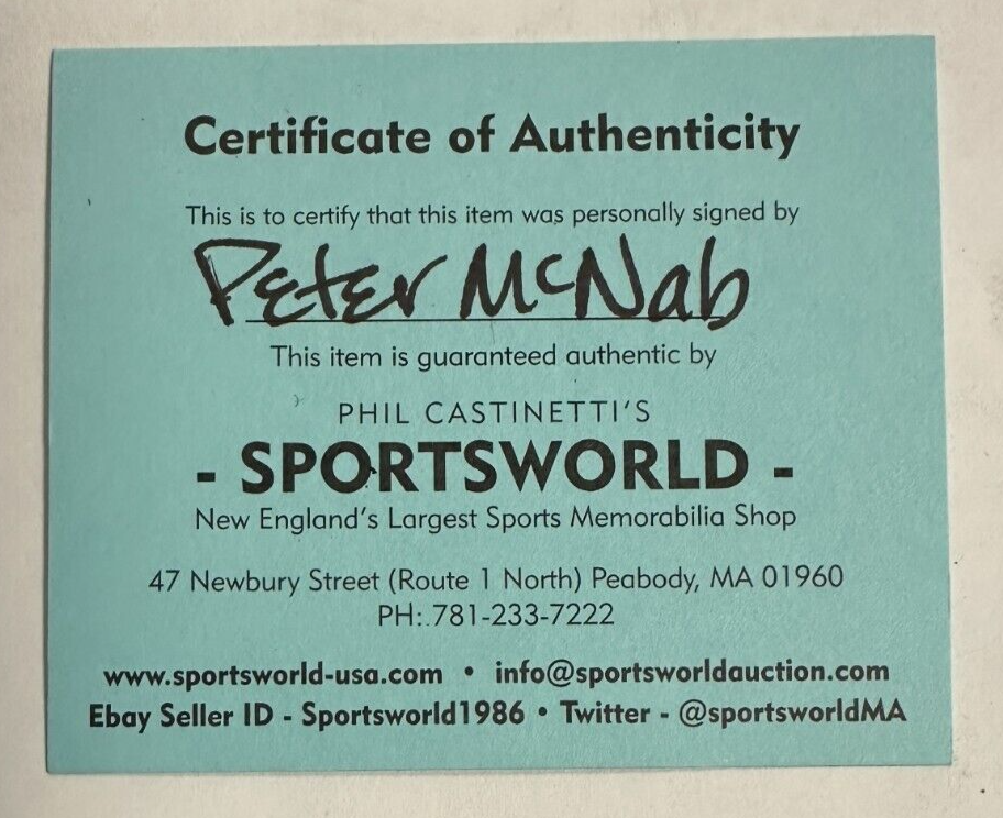 We're offering Official New Jersey Devils Hockey Puck Autographed by former NHL All-Star Peter McNab. It's in nm-mt condition and it comes with a COA Issued by Sportsworld, New England's Largest Sports Memorabilia Shop and his signature is guaranteed to be 100% authentic. We will combine on shipping for similar items!