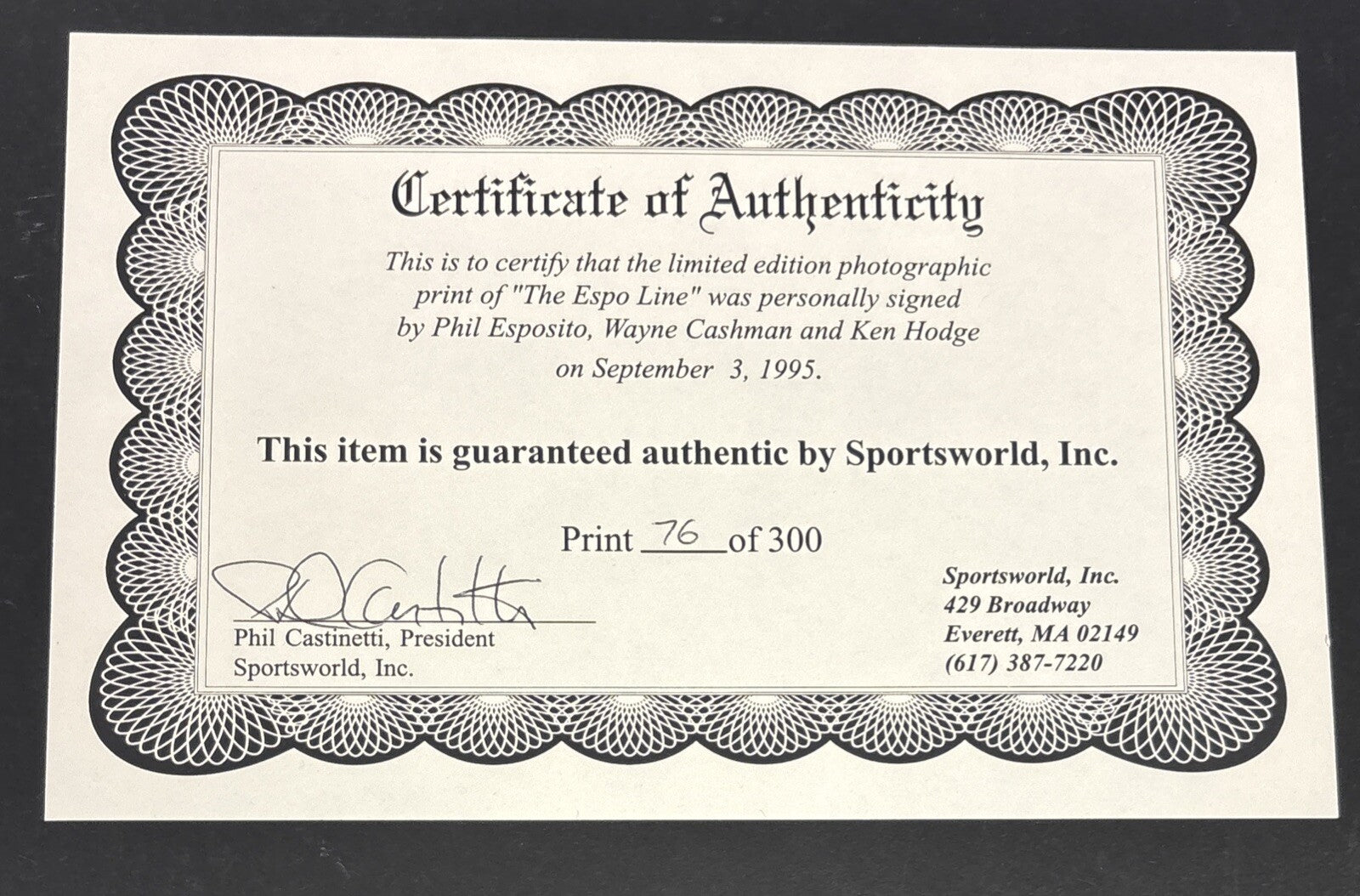 We're offering the 8x10 Photo autographed by the Famous "Esposito Line" of Hockey Hall of Famer Phil Esposito as well as NHL All-Stars Ken Hodge & Bruins Captain Wayne Cashman. It's a Limited Edition numbered 76/300 and it comes with a COA issued by Sportsworld, New England's Largest Sports Memorabilia Store and all of the signatures are guaranteed to be 100% authentic.