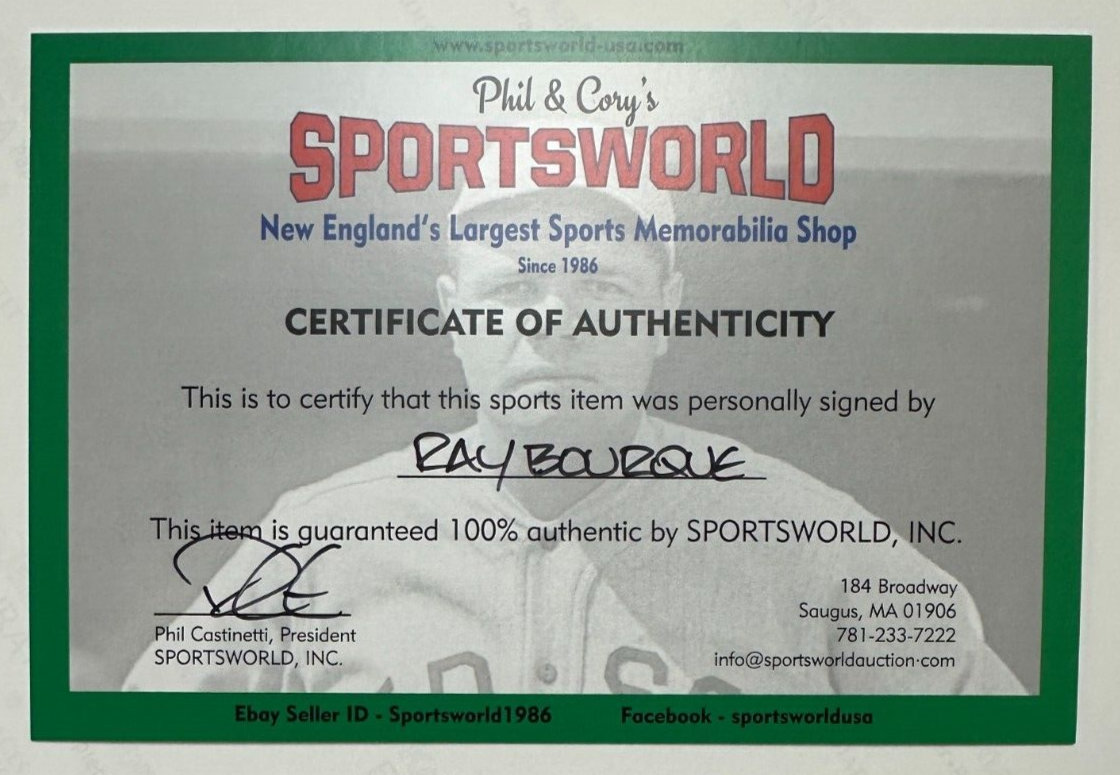 We're offering this 16x20 Photo Autographed by Ray Bourque of the Boston Bruins during his Hall of Fame Induction. It comes with a COA issued by Sportsworld New England's Largest Sports Memorabilia Store and their signatures are guaranteed to be 100% authentic. The photo is in nm condition, and we will combine on shipping for similar items!