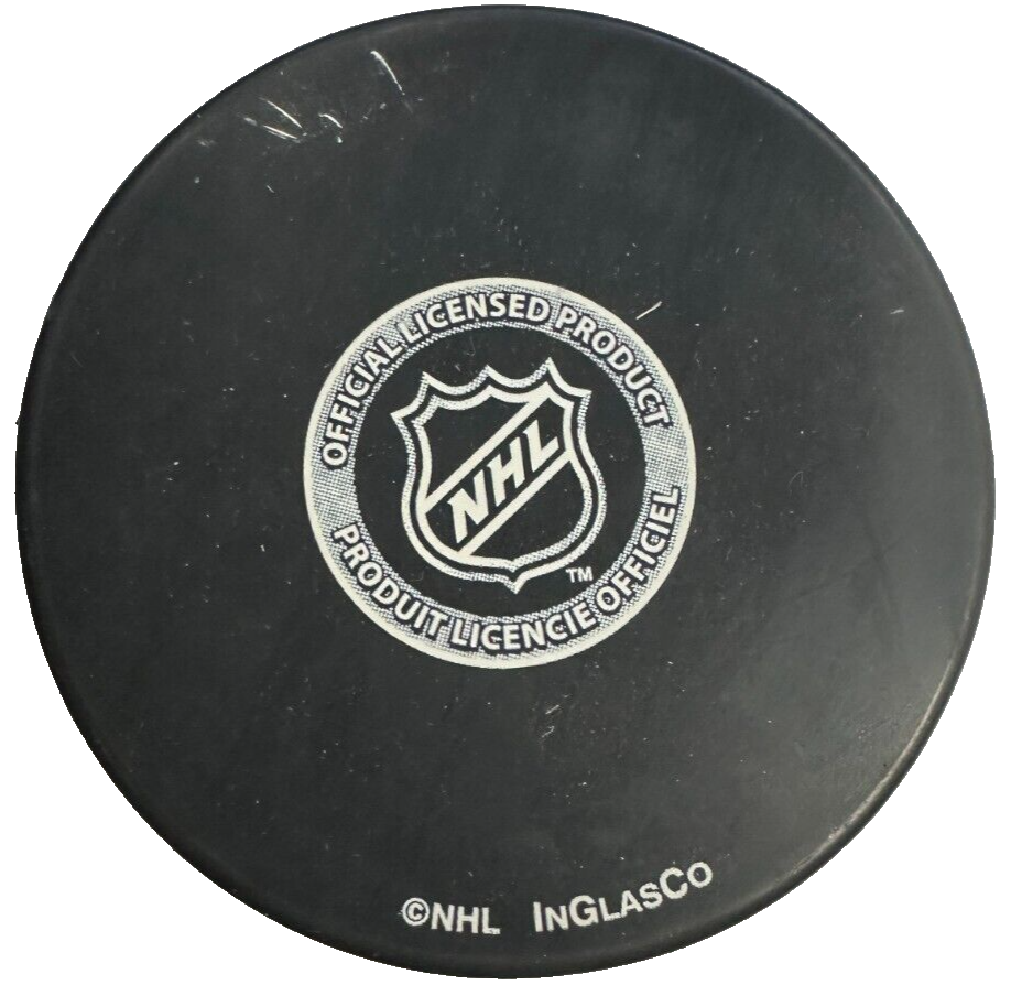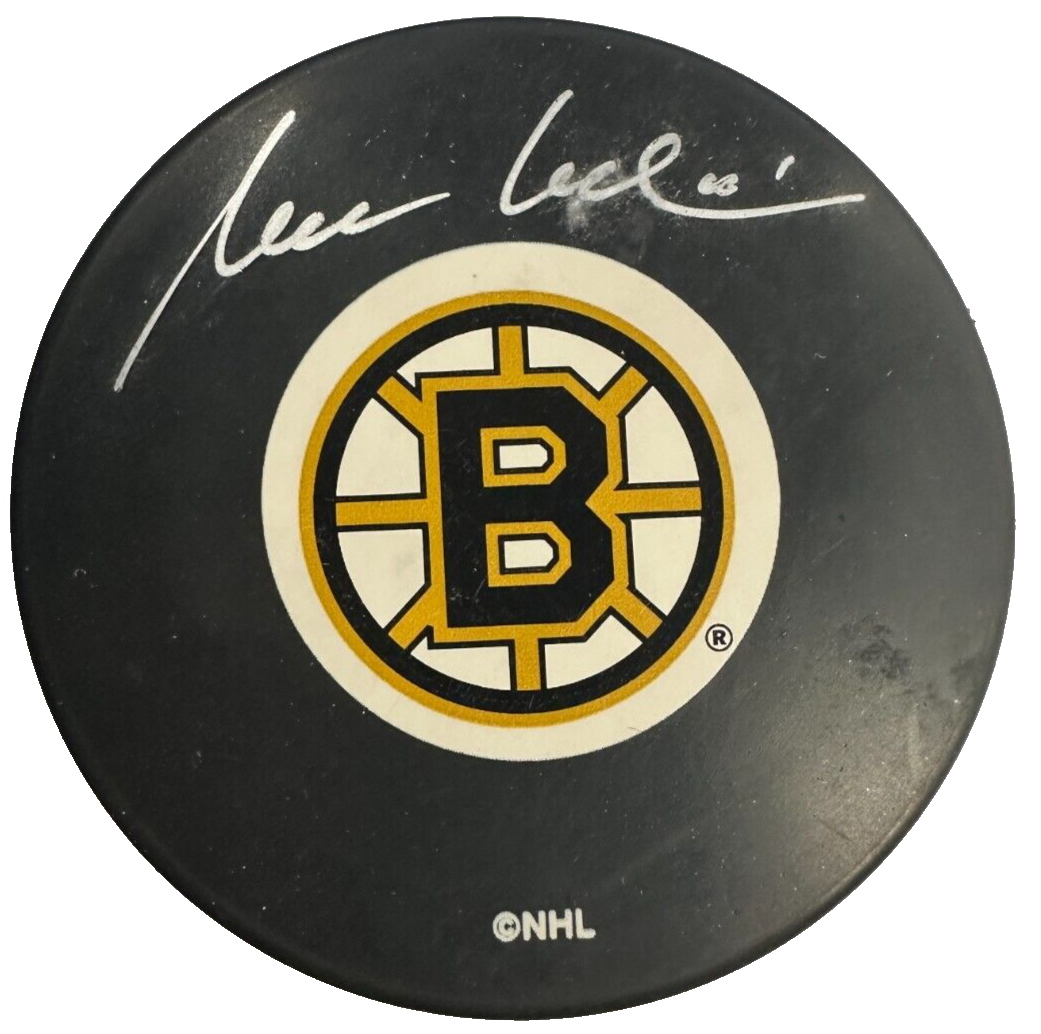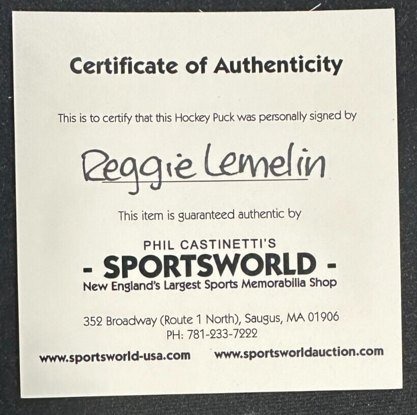 We're offering this Official Boston Bruins Hockey Puck Autographed by former Goalie Reggie Lemelin. It's in nm condition and it comes with a COA Issued by Sportsworld, New England's Largest Sports Memorabilia Store and his signature is guaranteed to be 100% authentic. We do have multiples of this puck signed by Reggie, so the puck you receive might not be the exact puck in the photo. The puck will be shipped in a plastic display square.