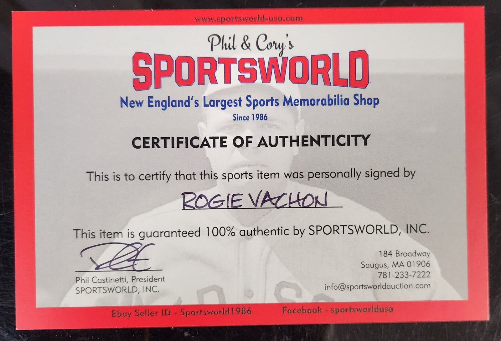 The COA is from Sportsworld- New England's largest sports memorabilia shop. Please refer to our pictures to be sure.
