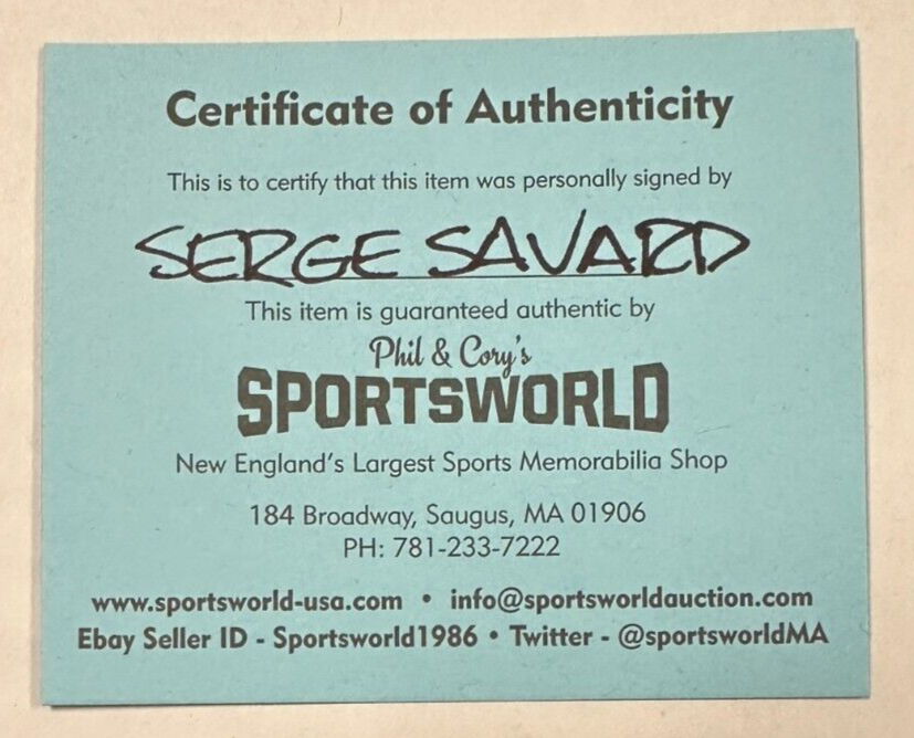 We're offering this Photo Puck Autographed by Hockey Hall of Famer Serge Savard of the Montreal Canadiens. It's in perfect condition and it comes with a COA Issued by Sportsworld, New England's Largest Sports Memorabilia Shop and his signature is guaranteed to be 100% authentic. The puck will be shipped in a plastic display square and, we will combine on shipping for similar items.