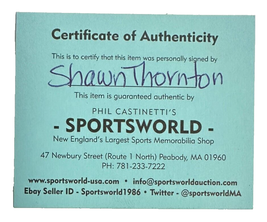 We're offering this Boston Bruins Hockey Puck Autographed by former Star Shawn Thornton. It's in nm condition and it comes with a COA issued by Sportsworld. New England's Largest Sports Memorabilia Store and his signature is guaranteed to be 100% authentic. We do have multiple pucks signed by Shawn so the puck that you receive might not be the puck in the photo. It will be shipped in a plastic display square, and we will combine on shipping for similar items!