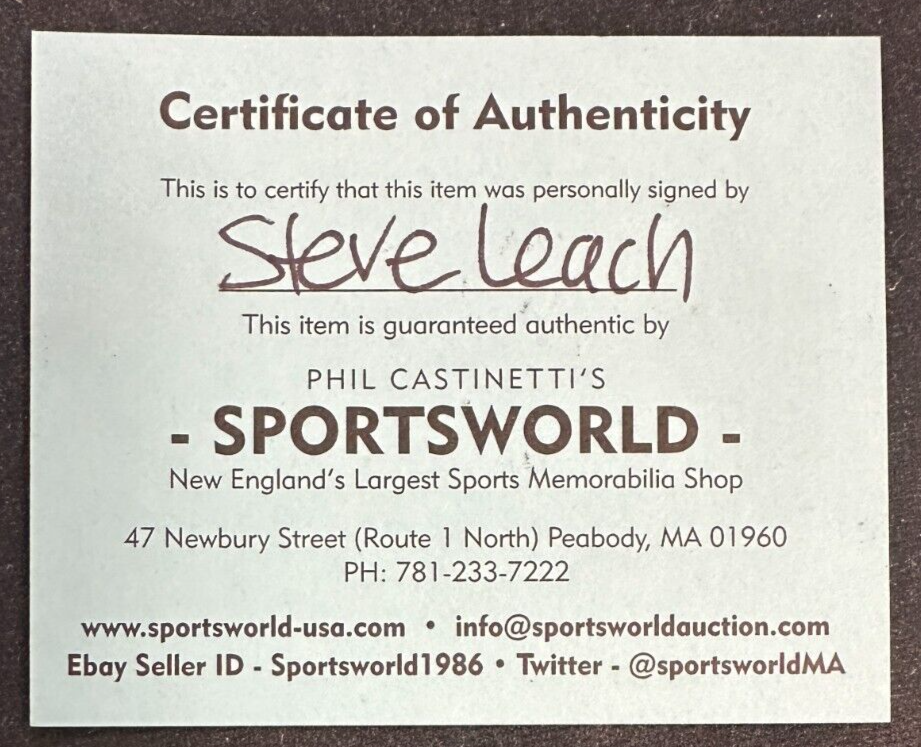 We're offering this Official Boston Bruins Hockey Puck Autographed by former star Steve LeachIt's in nm condition and it comes with a COA Issued by Sportsworld, New England's Largest Sports Memorabilia Store and his signature is guaranteed to be 100% authentic.  We do have multiples of this puck signed by Steve, so the puck you receive might not be the exact puck in the photo. The puck will be shipped in a plastic display square.