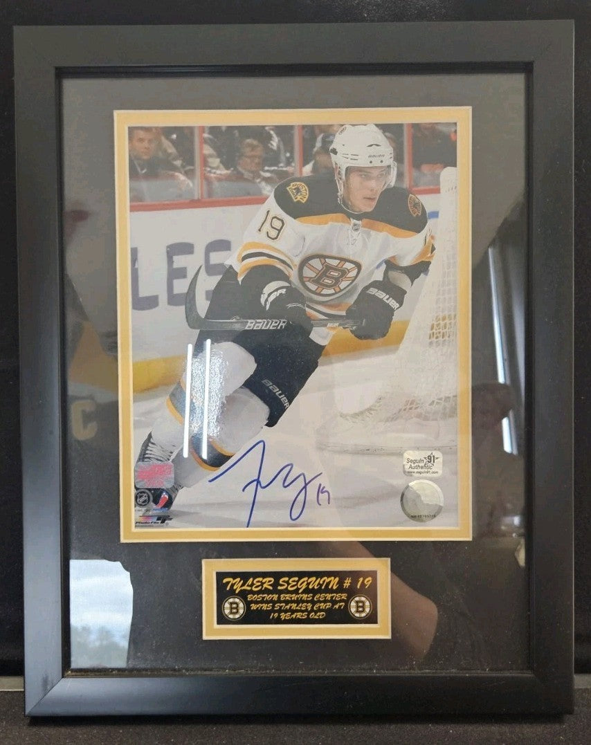 The product is a framed 8x10 photo of Tyler Seguin, signed by the player himself. The autograph is authenticated by Seguin Authentic, adding value and authenticity to the item. This piece would make a great addition to any fan's collection, especially those who support the Boston Bruins. The originality of the autographed photo adds to its rarity and uniqueness, making it a prized possession for any hockey enthusiast.
