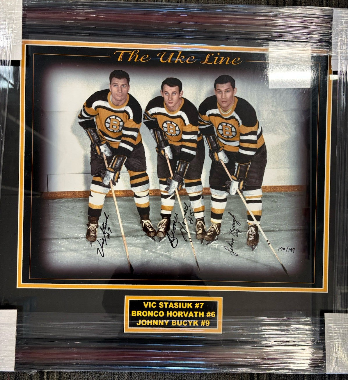 Uke Line Johnny Bucyk Vic Stasiuk Bronco Horvath Boston Signed Auto 16x20Photo
