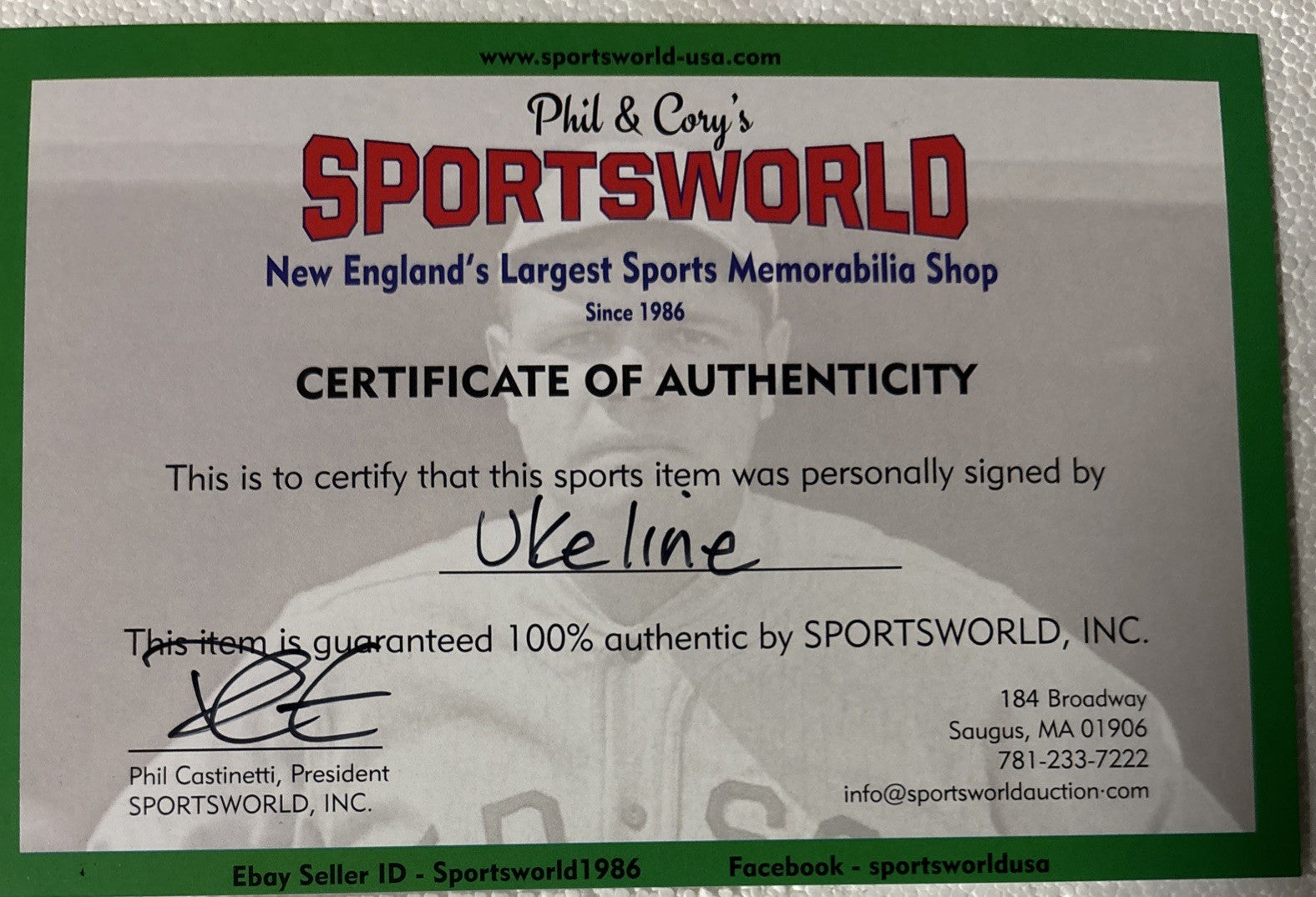 The product is a 16x20 autographed photo of hockey players Johnny Bucyk, Vic Stasiuk, and Bronco Horvath from the Boston Bruins as “The Uke Line” The signature of the players is authenticated by Sportsworld, adding value and authenticity to the piece.