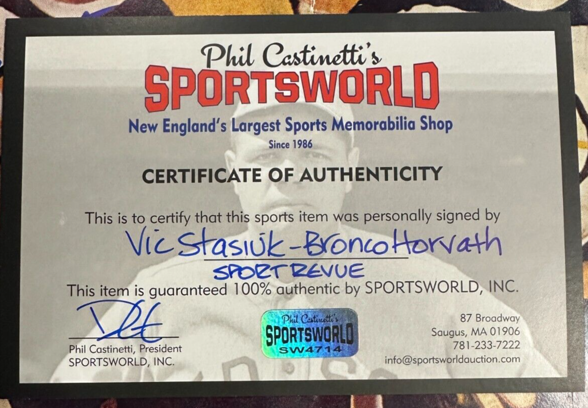 We're offering this March 1960 Issue of the Sport Revue Magazine Autographed on the cover by former Boston Bruins All-Stars Vic Stasiuk & Bronco Horvath. It's in good condition, it comes with a COA Issued by Sportsworld, New England's Largest Sports Memorabilia Store and his signature is guaranteed to be 100% authentic. We will combine on shipping for similar items!