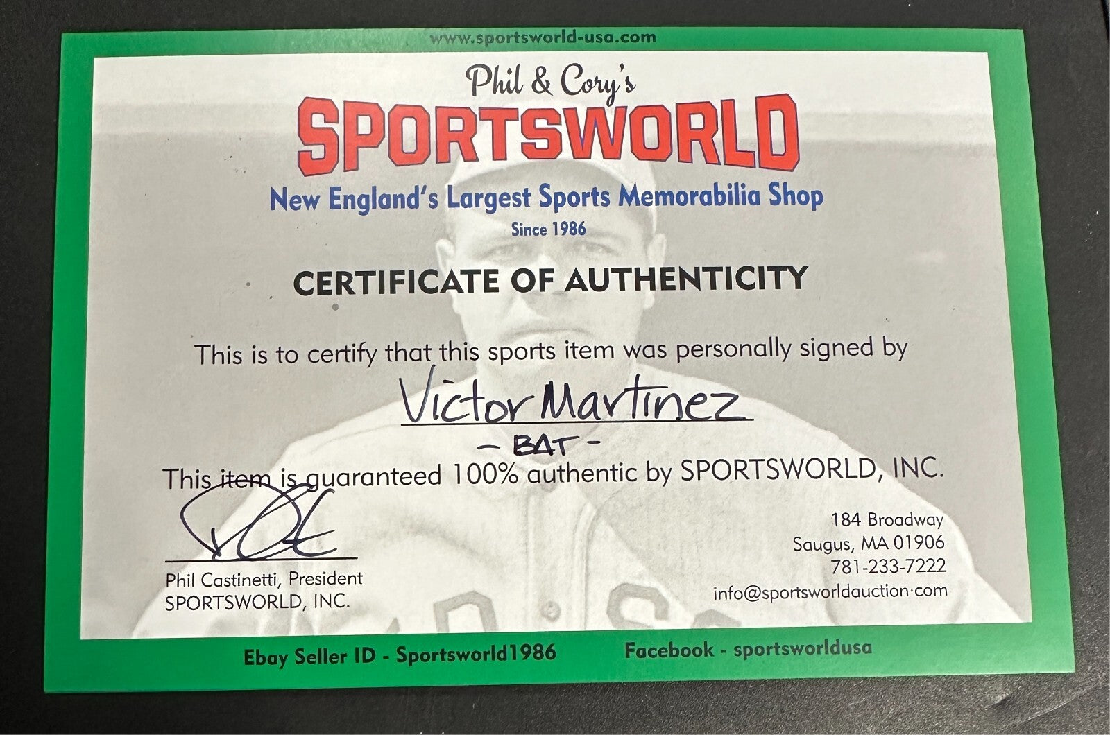 We're offering this Rawlings Big Stick Model Autographed by former Boston Red Sox C / 1st Baseman Victor Martinez. It's signed beautifully in silver on the barrel by Victor and comes with a COA issued by Sportsworld, New England's Largest Sports Memorabilia and his signature is guaranteed to be 100% authentic and we will combine on shipping for similar items!