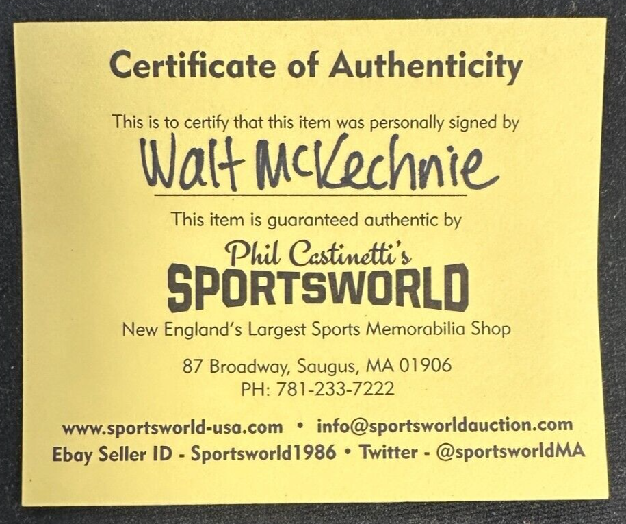 We're offering this Multi Team Photo Puck Autographed by former NHL Star Walt McKechnie. It's in nm condition and comes with a COA issued by Sportsworld, New England's Largest Sports Memorabilia Store and his signature is guaranteed to be 100% authentic. We do have multiple pucks signed by Walt so the puck you receive might not be the exact puck in the photo. The puck will be shipped in a plastic display square, and we will combine shipping on similar items.