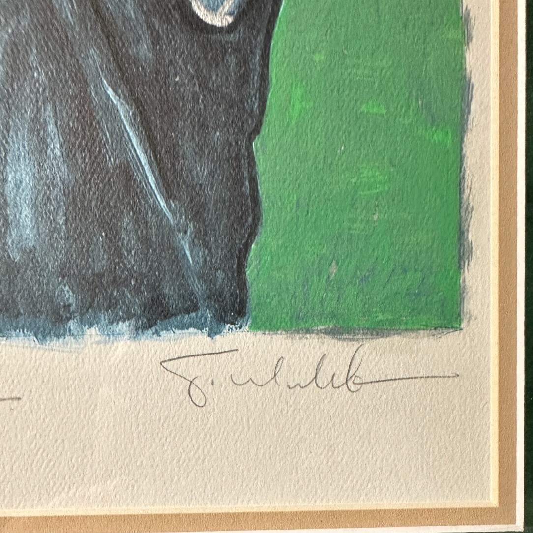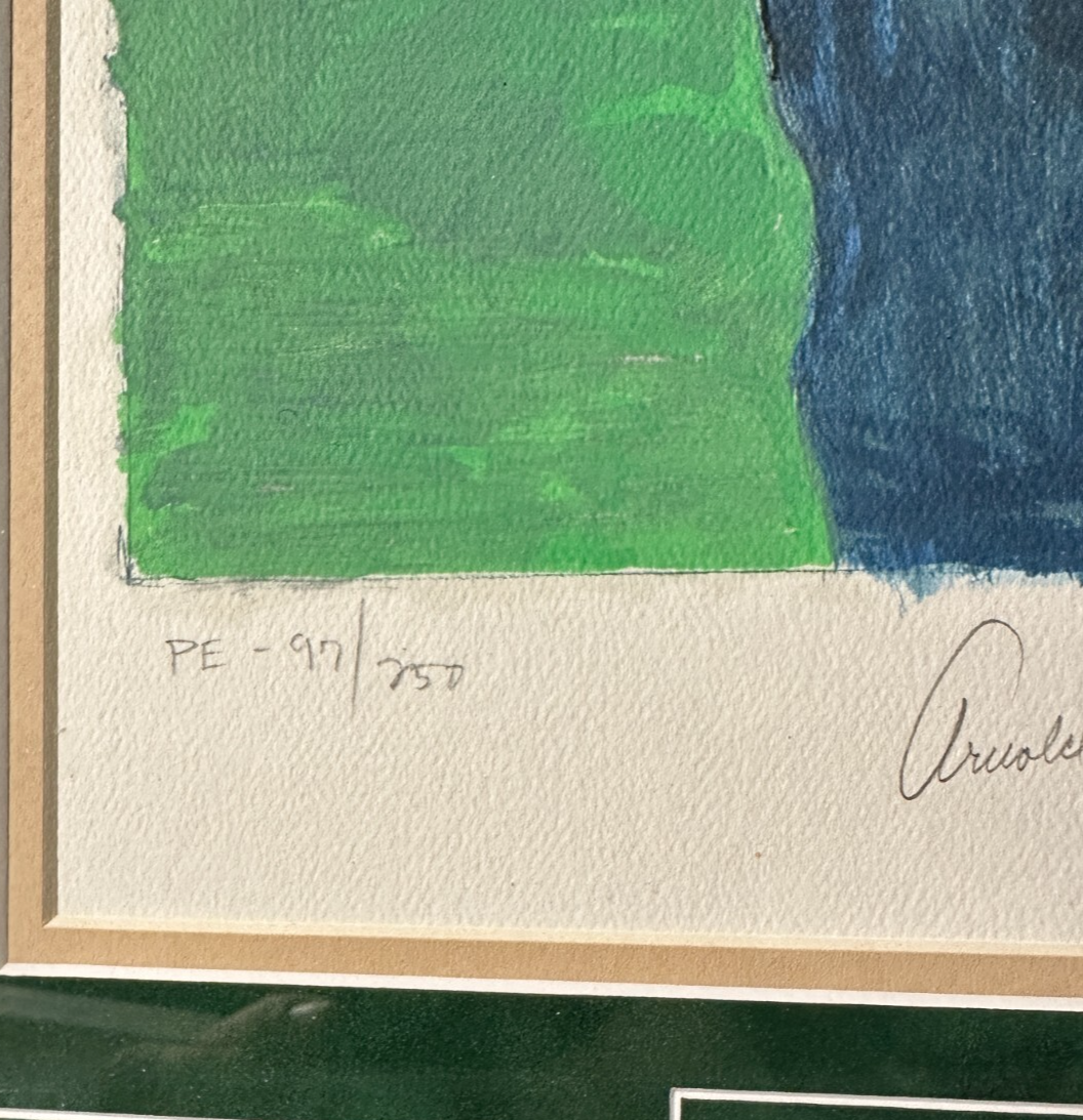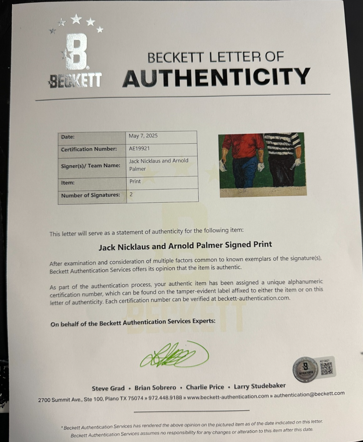 We're offering this Beautiful Scott Medlock Lithograph Autographed by PGA Golf Legends Arnold Palmer & Jack Nicklaus as well as the artist. It's a limited edition numbered 97/250 and has been beautifully matted and framed. It comes with a Full Letter LOA and Matching Hologram issued by BAS (AE19921) Beckett Authentication Services and both signatures are guaranteed to be 100% authentic. The entire piece measures 31" x 25".