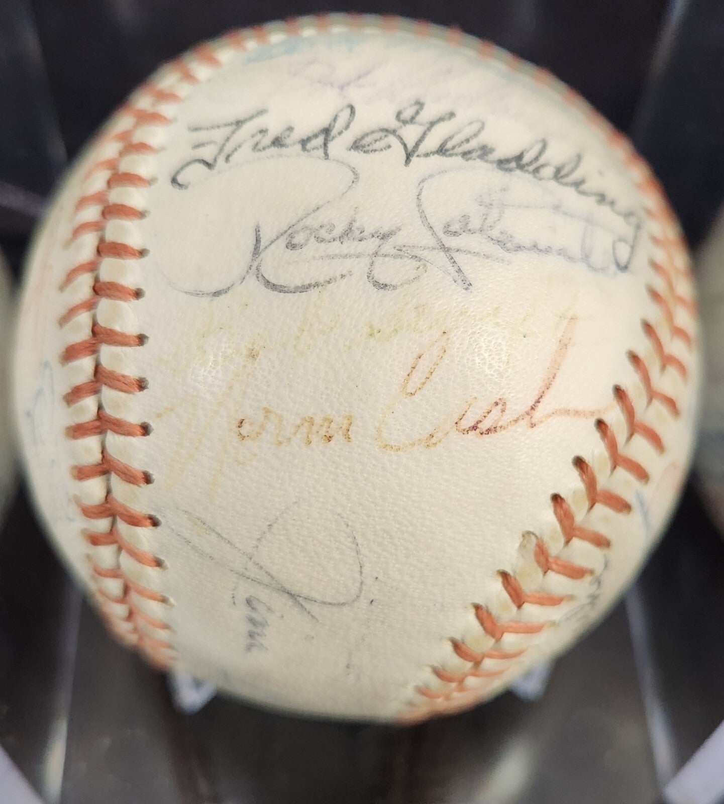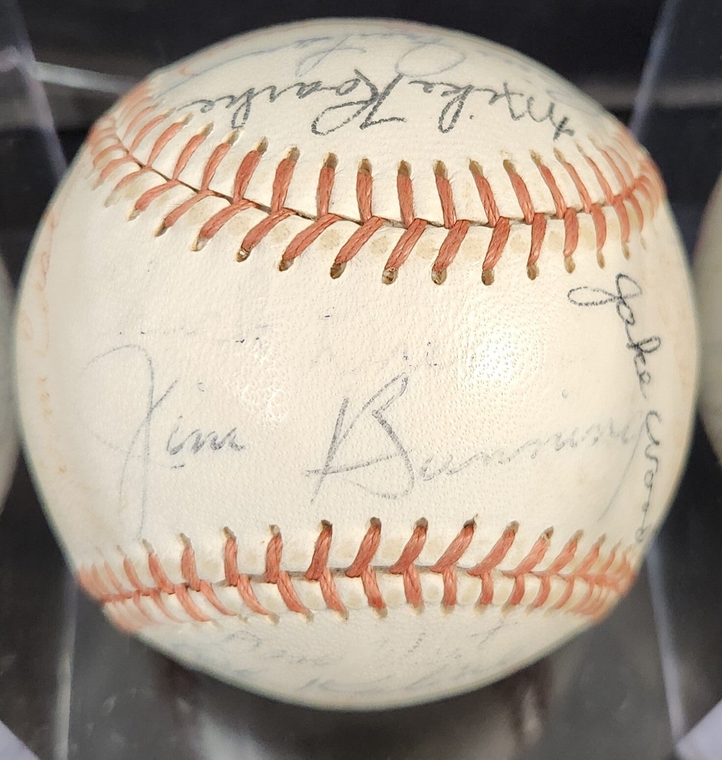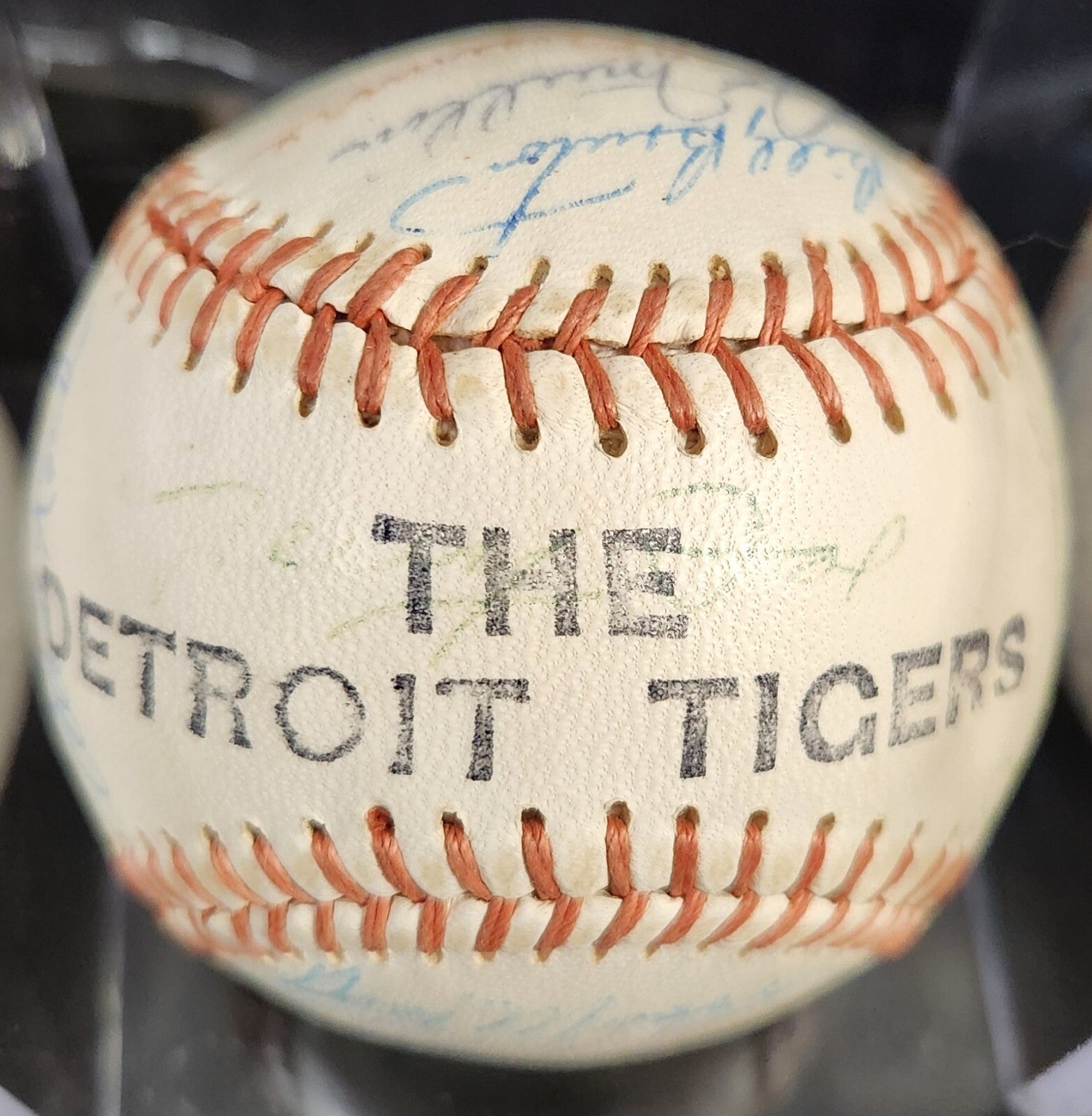 This unique baseball is a must-have for any avid sports fan. It features the signatures of the 1963 Detroit Tigers team, including Al Kaline , Whitey Herzog and Jim Bunning who are all in the Hall of Fame. Other players include Norm Cash, Rocky Colavito, Bill Freehan, Hank Aguirre, Terry Fox, Gus Triandos, Frank Larry, Alan Koch, Fred Gladding, Phil Regan, Tom Sturdivant, Mike Roarke, Don Mossi, Bubba Phillips, Dick McAuliffe, Don Wert, Jake Wood, George Thomas, Bill Faul, Gates Brown and Bill Bruton etc. The ball have a Detroit Tigers stamp on it and we are not sure of the manufacturer's.
