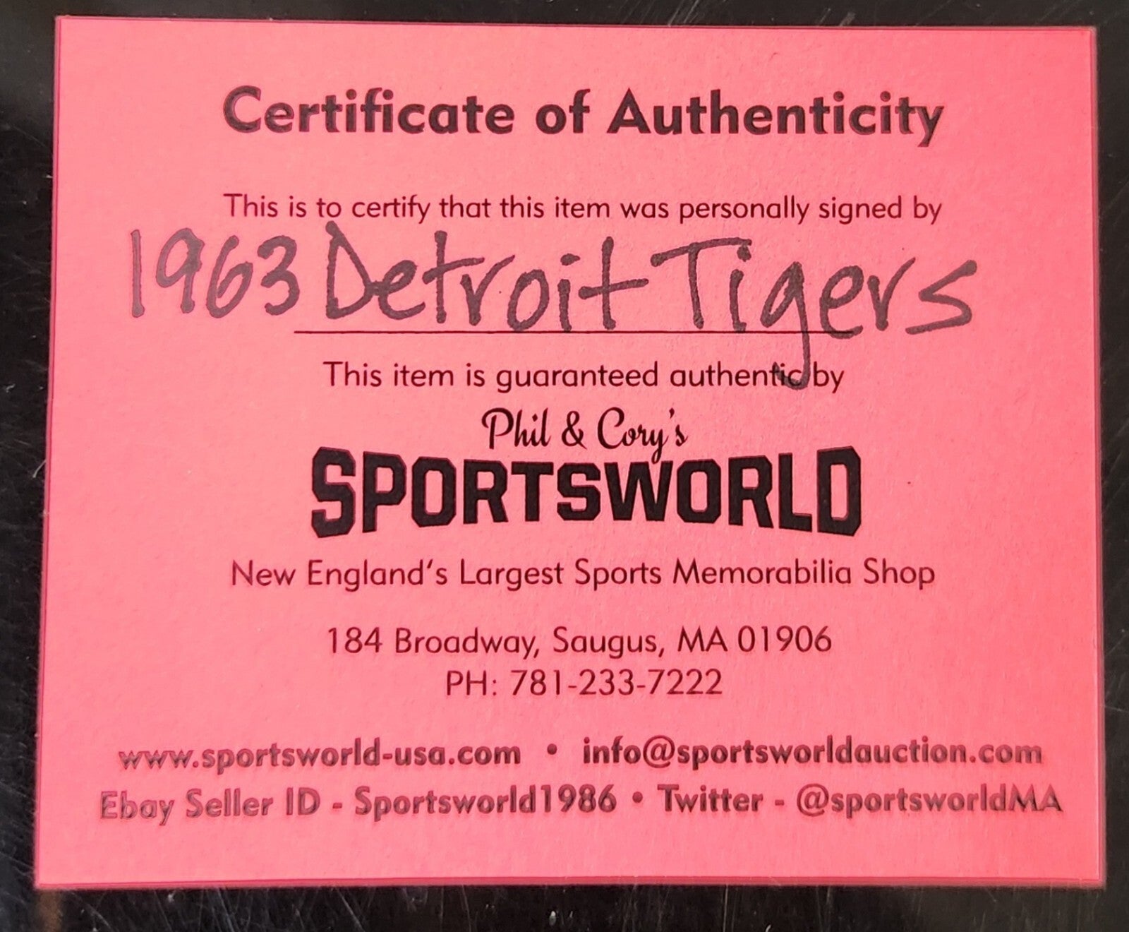 The COA is from Sportsworld- New England's largest sports memorabilia shop. Please refer to our pictures to be sure.