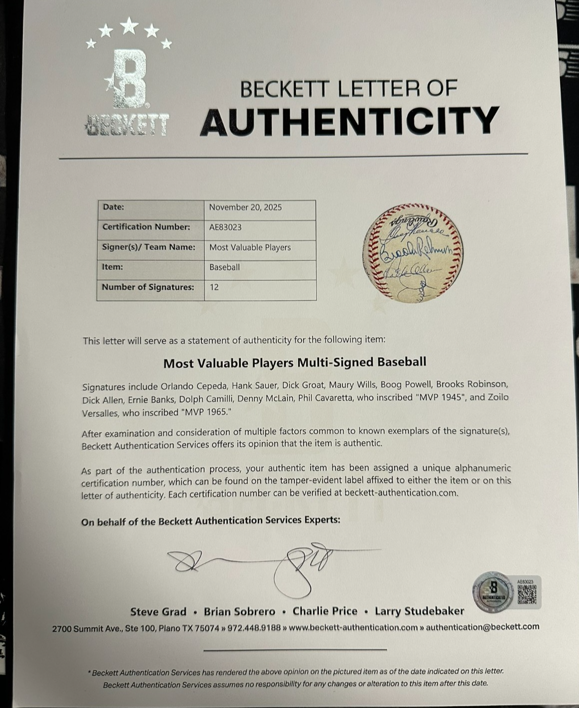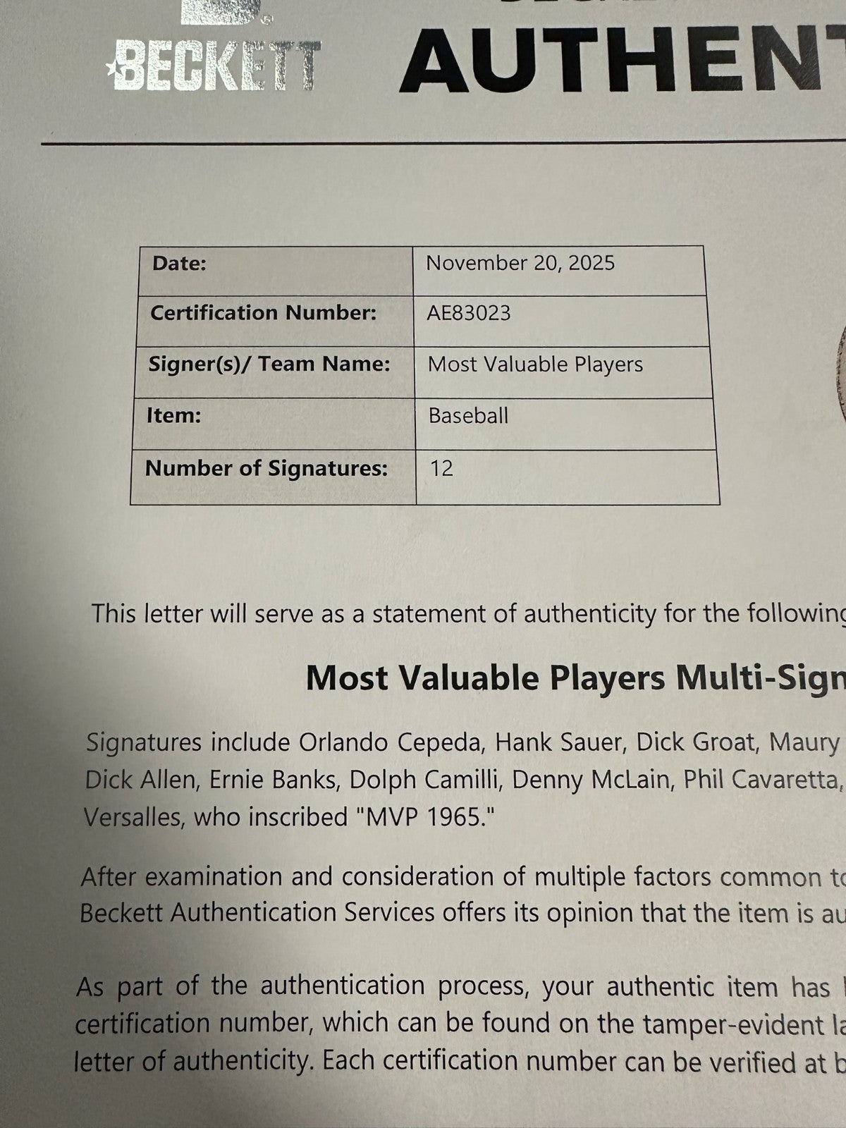We're offering this Official National League Baseball Autographed by 12 former AL & NL MVP's. Signatures on the ball include Hall of Famers Ernie Banks, Orlando Cepeda & Brooks Robinson as well as Dick Allen, Dick Groat, Hank Sauer, Maury Wills, Dolph Camilli, Denny McLain, Boog Powell & Phil Cavaretta (MVP 1945 Insc) & Zolio Versalles (MVP 1965 Insc). it's in excellent condition and with a Full Letter LOA & Matching Hologram issued by BAS Beckett Authentication Services (AE86023) and his signature is guaranteed to be 100% authentic. The ball will be shipped in a plastic display cube, and we will combine on shipping for similar items.