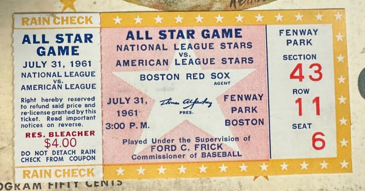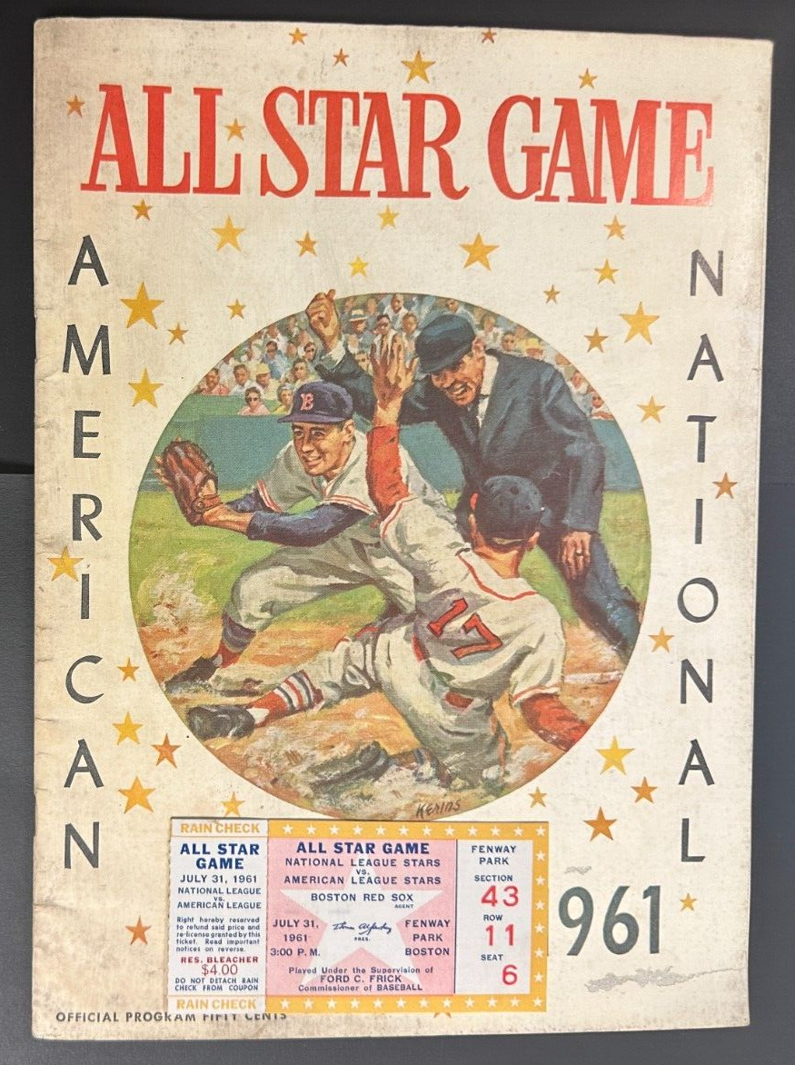 We're offering this vintage program & ticket stub from the 1961 MLB All-Star Game at Fenway Park in Boston on July 11th. The program is in ex condition and is not scored inside. The ticket stub is in ex-mt+ condition. The National League won the game 5-4, behind a triple, a single & 2 RBI's from Roberto Clemente. We will combine on shipping for similar items!