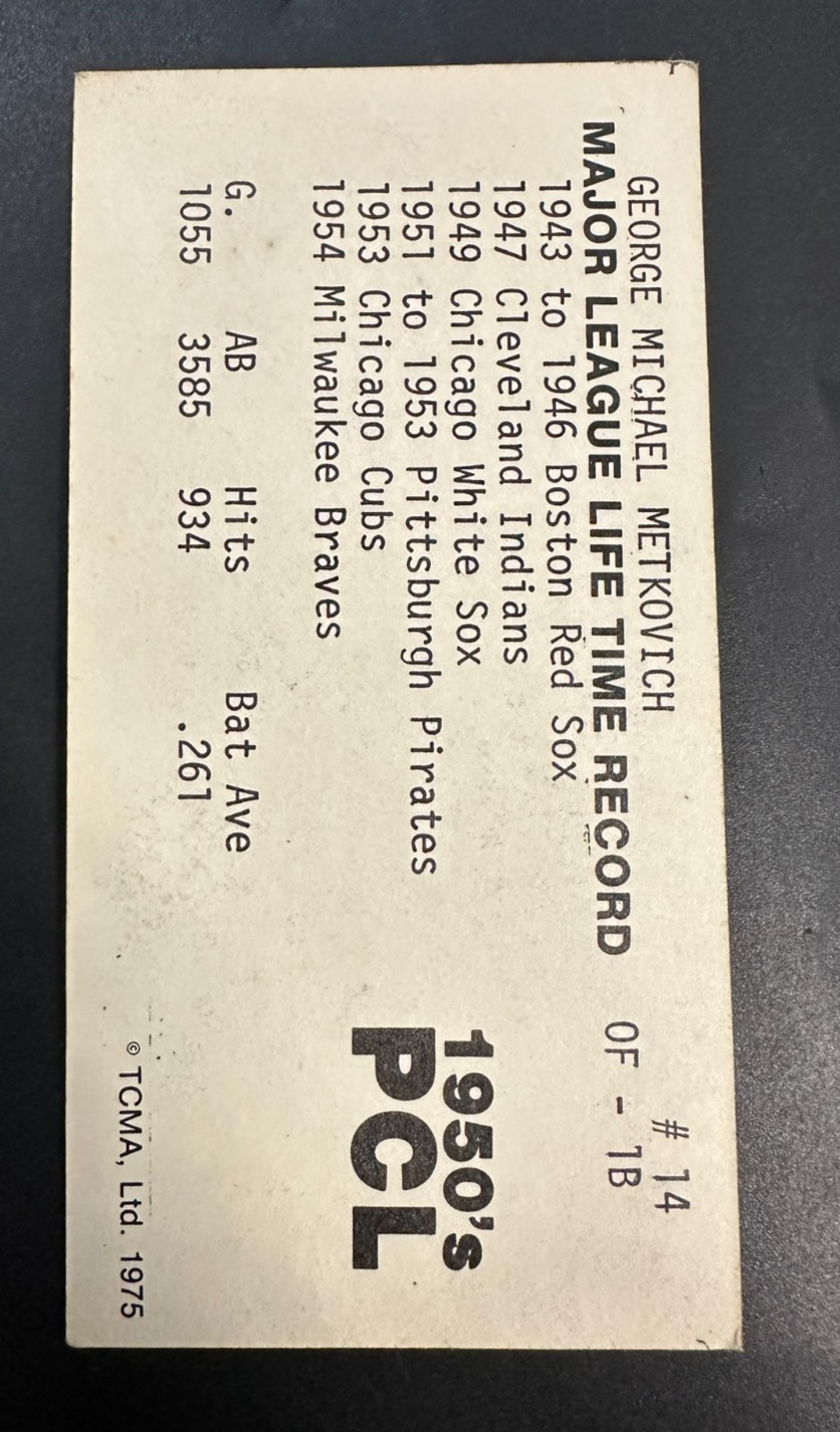 1975 TCMA 1950's Pacific Coast League George Metkovich #14 Vancouver Mounties