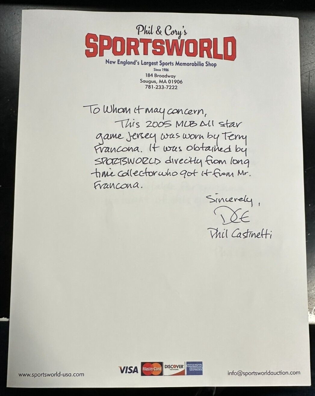 We're offering this 2005 American League All-Star Game Jersey worn by American League Manager Terry Francona of the Boston Red Sox during the 2005 All-Star game at Yankee Stadium in New York. It's made by Majestic, is a size 48 and shows some wear. It was obtained directly from Mr. Francona, and it comes with a Full Letter LOA Issued by Sportsworld, New England's Largest Sports Memorabilia Shop and is guaranteed to be 100% authentic and, we will combine on shipping for similar items!