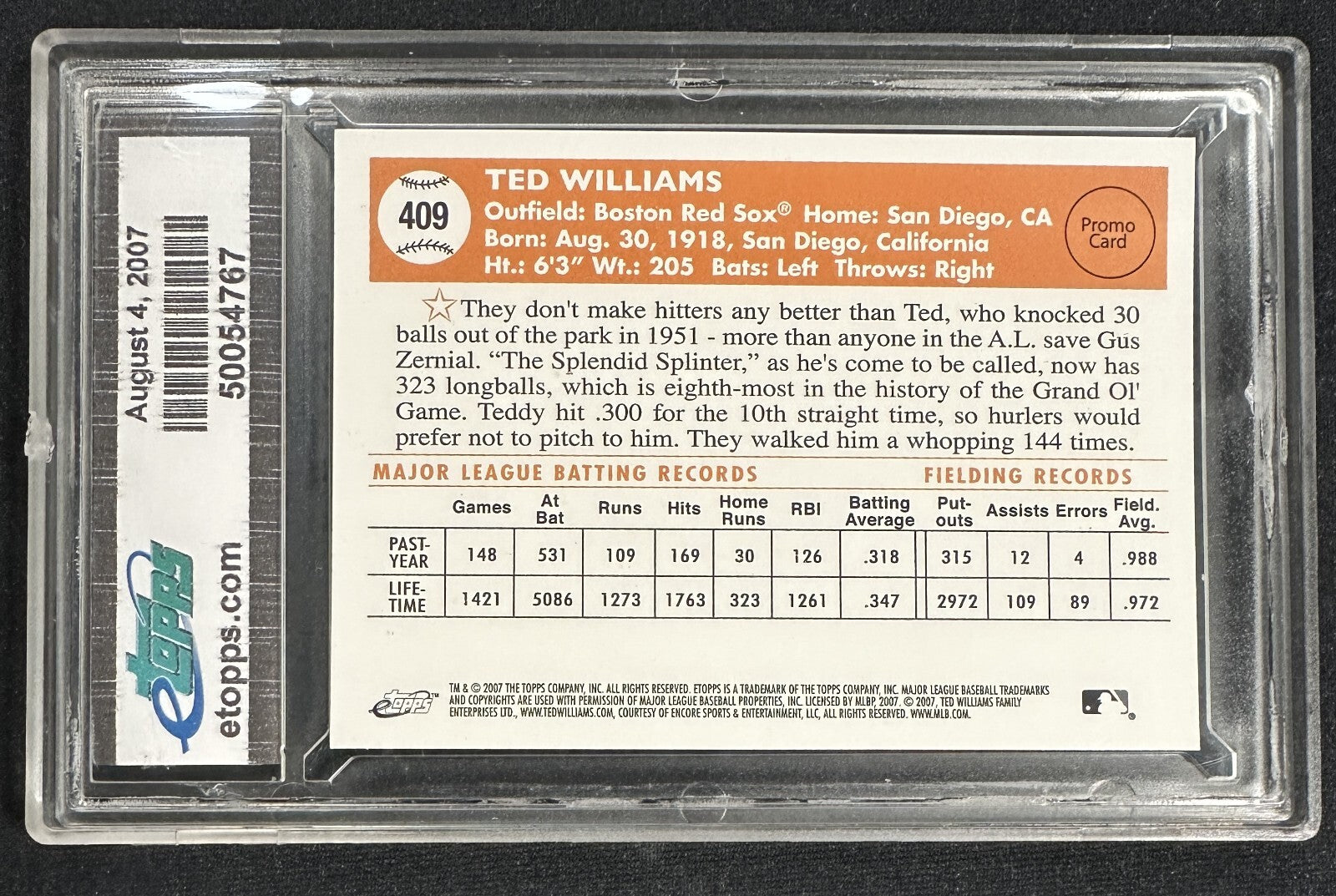 We're offering this 2007 E-Topps 1952 Ted Williams econ 5 National Convention Red Parallel Card. It's numbered 1/25 and is in mint condition.