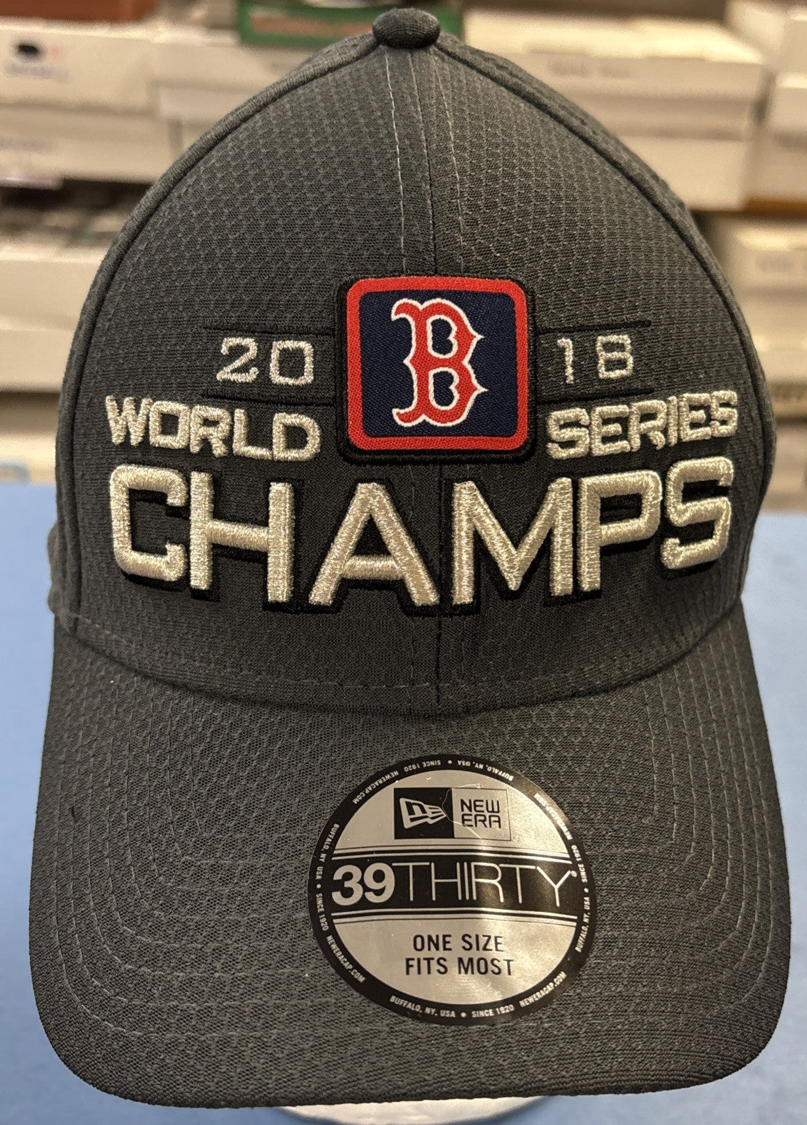 The product is a 2018 World Series Champions Boston Red Sox hat by New Era, made of cotton in a gray color. It is a baseball cap designed for men in one size fits most. This hat commemorates the Red Sox's victory in the World Series, making it a must-have accessory for any baseball fan or Red Sox supporter. The hat's design and material ensure both style and durability for fans to show off their team pride for years to come.