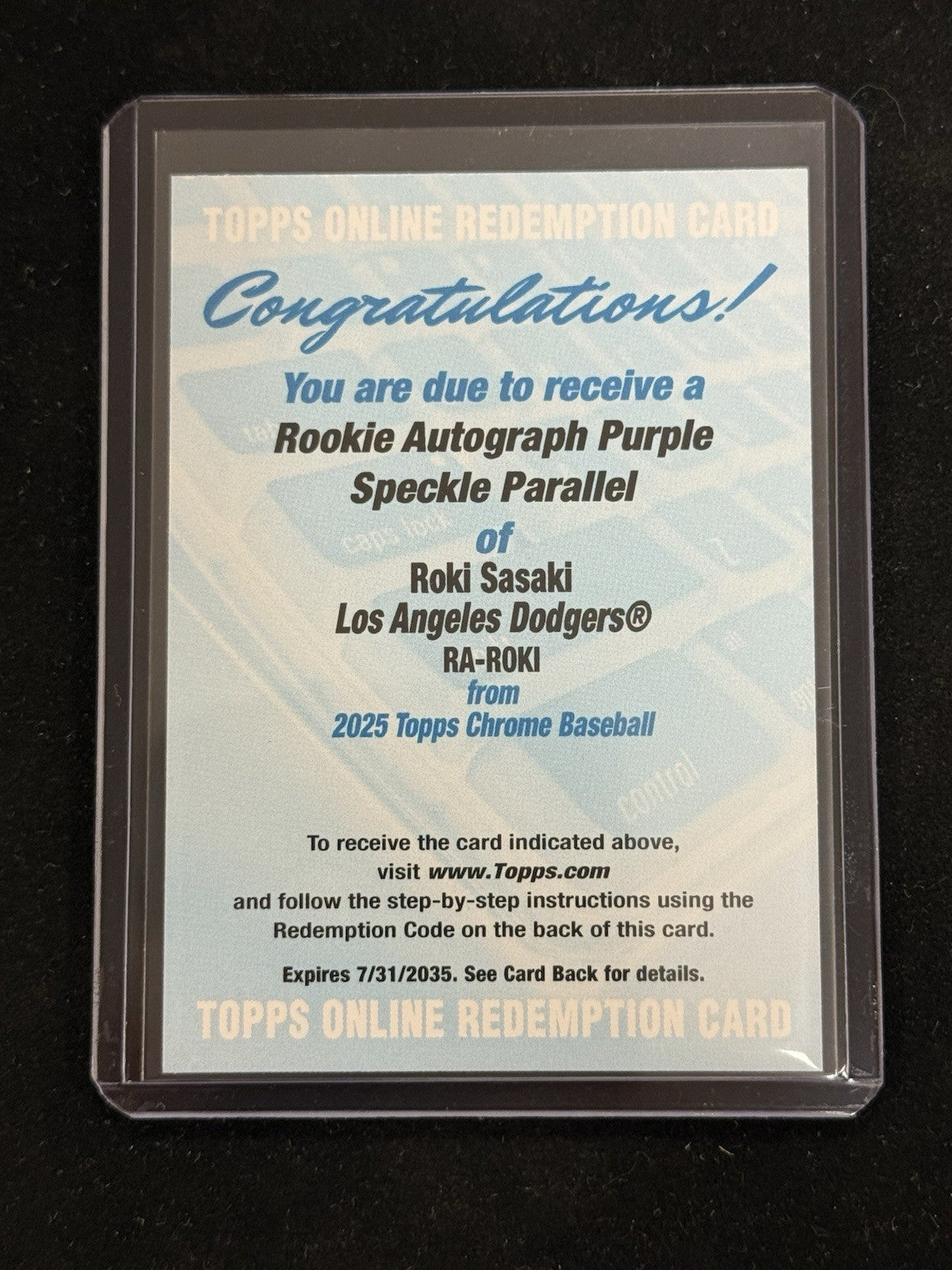 2025 Roki Sasaki Topps Chrome Purple Speckle Auto /299 Rookie RC trading card featuring the player autographed by Roki Sasaki. This baseball card is part of the Major League (MLB) and belongs to the Los Angeles Dodgers team. The card is a chrome variety from the Topps manufacturer with a card number of RA-ROKI, making it a sought-after item for collectors due to its rarity and rookie status. UNUSED REDEMPTION!