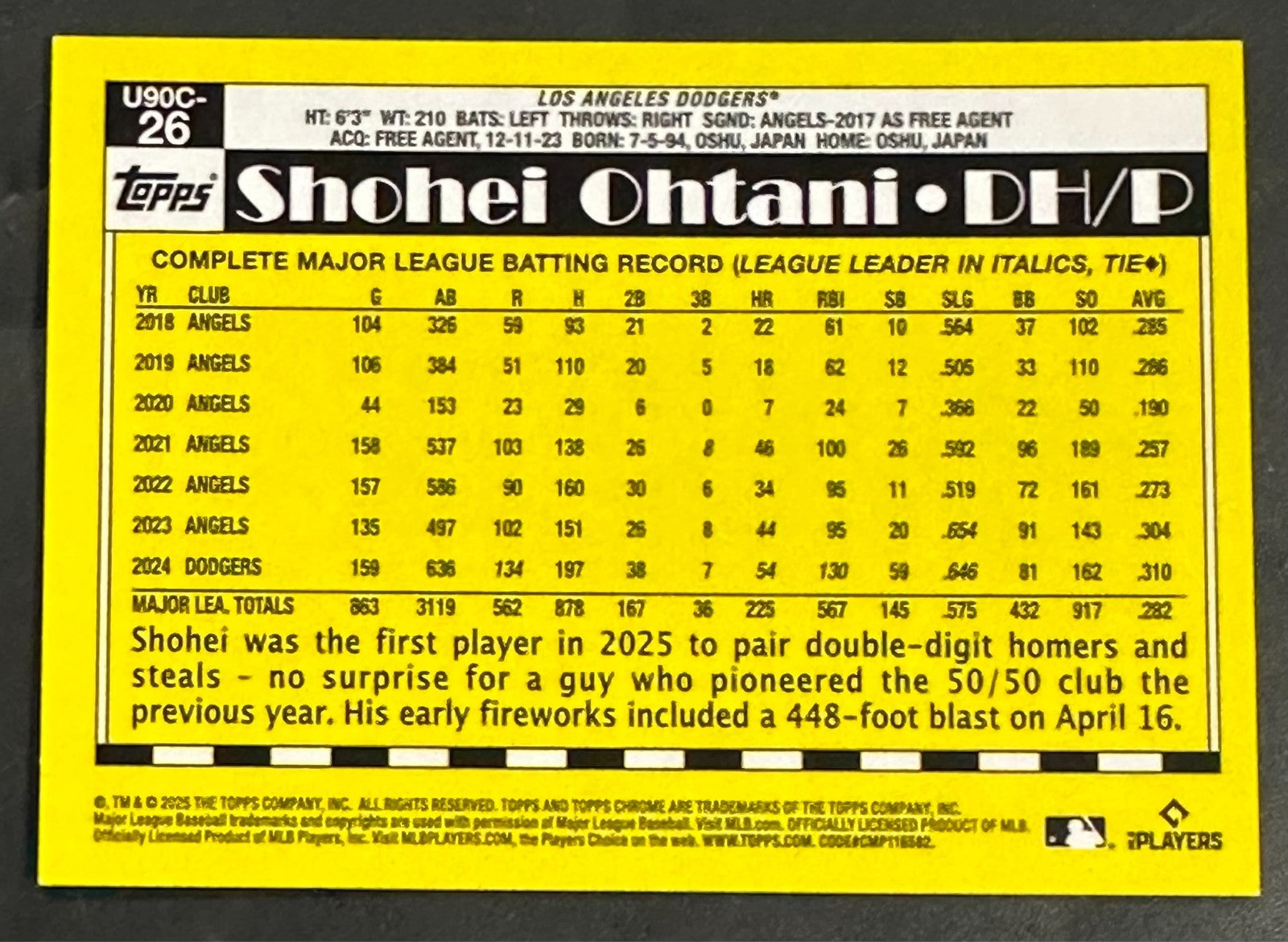 We're offering this 2025 Topps Chrome Shohei Ohtani 1990 Topps Chrome Silver Pack Red Refractor Card. It's numbered 1/5, is card U90C-26 inn the set and is in mint condition right out of the pack.