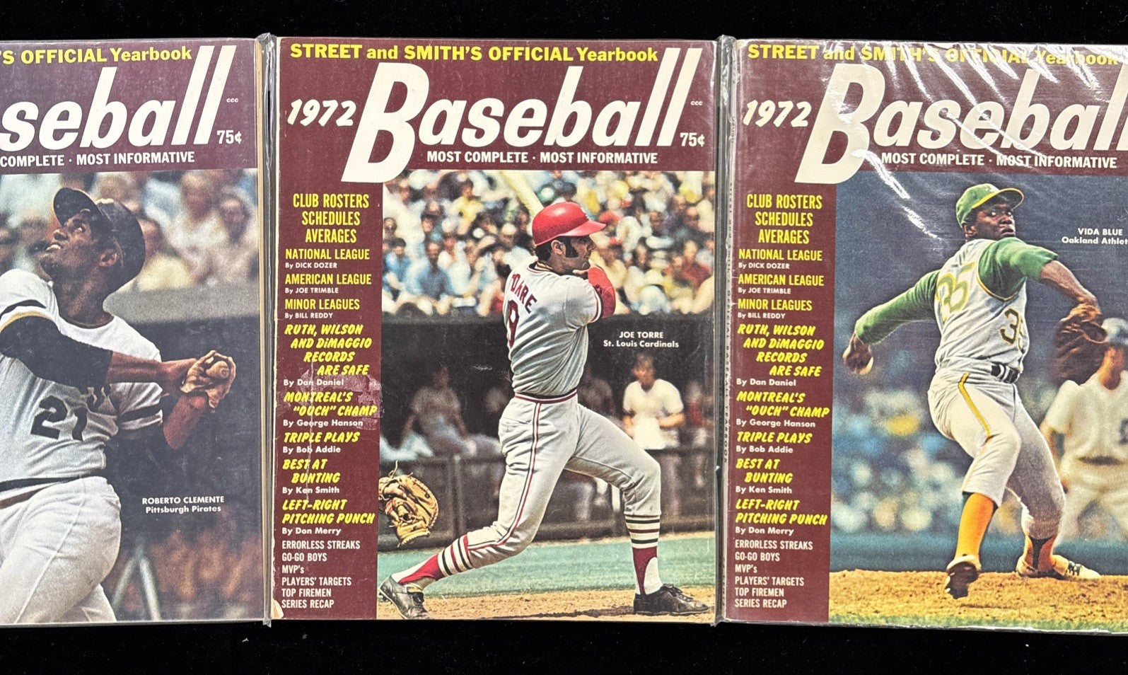 The product is a set of three Street & Smith Sports Yearbooks from 1972 featuring baseball legends such as Roberto Clemente, Joe Torre, and Vida Blue. These vintage yearbooks are in excellent condition, making them a valuable piece of sports memorabilia for collectors and fans of baseball history. Each yearbook provides a unique insight into the world of baseball during that time, showcasing the top players, teams, and moments from the 1972 season. Ideal for avid collectors or enthusiasts of vintage sports memorabilia, these yearbooks offer a nostalgic glimpse into the baseball world of the past.