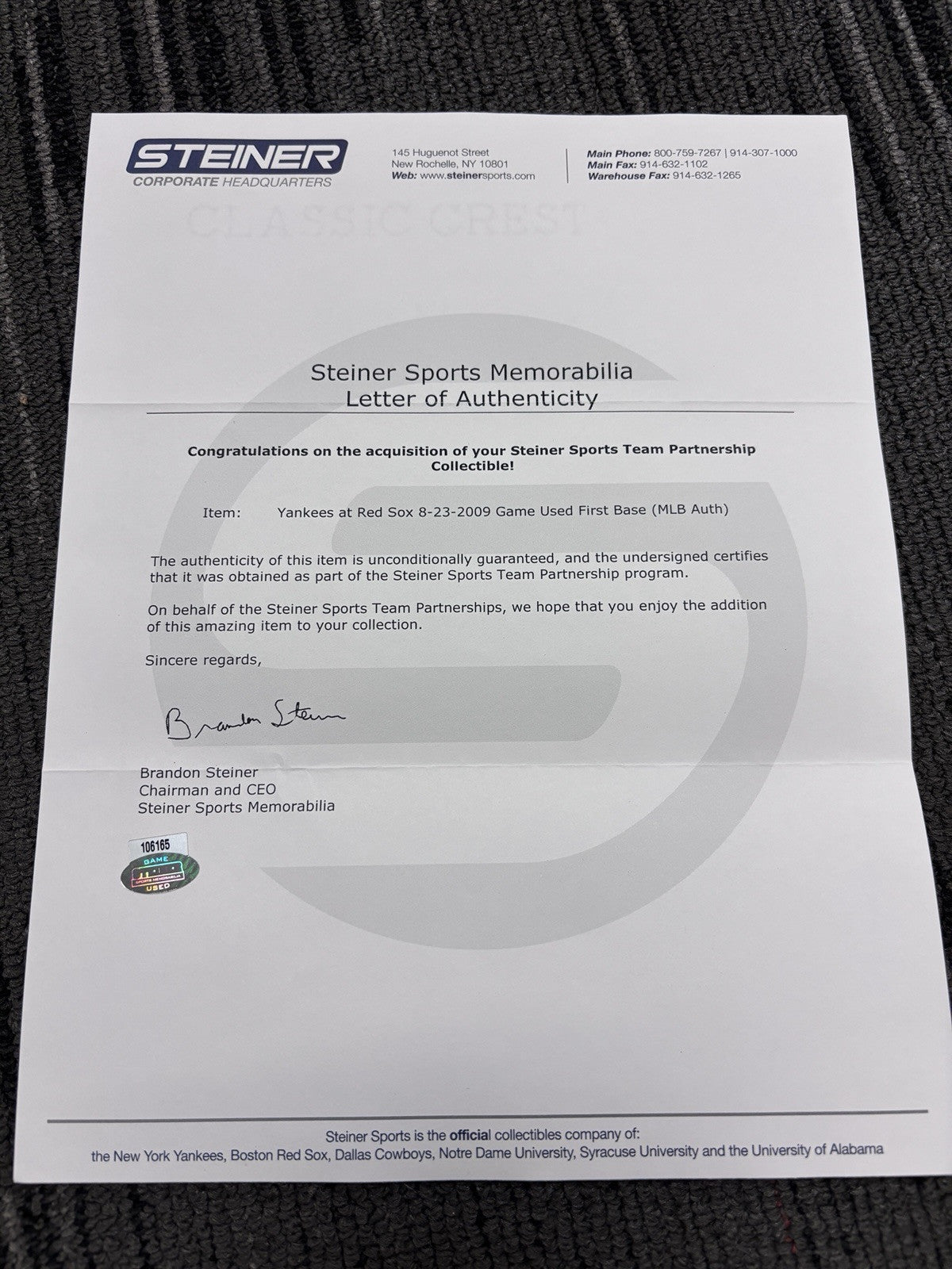 Experience a piece of baseball history with the 8-23-2009 Yankees at Red Sox game-used Base with ticket and program. An officially licensed product, this memorabilia is a tangible connection to the iconic Boston Red Sox team and the thrill of Major League Baseball.