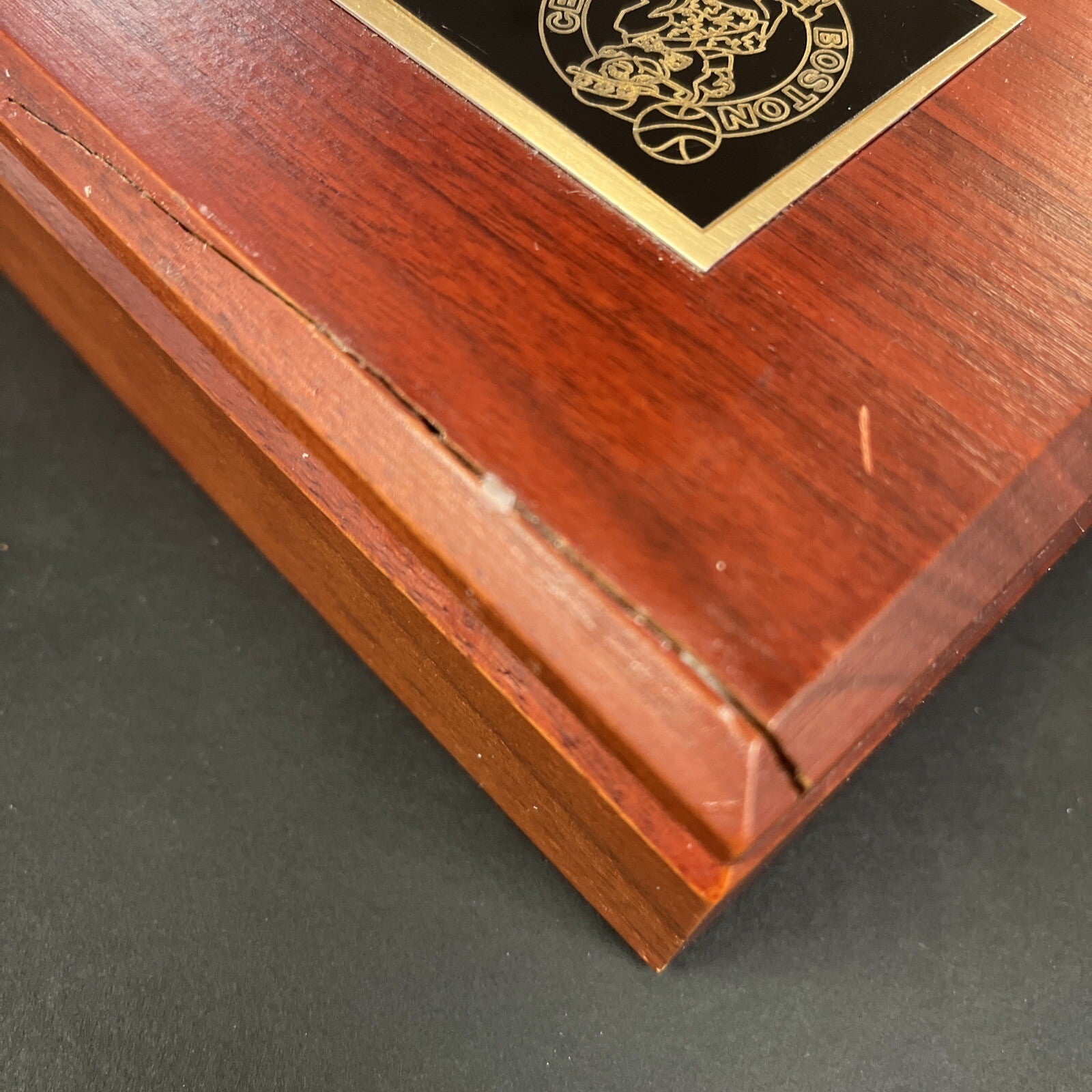 This authentic piece of the Parquet floor from the old Boston Garden Autographed by Pro Basketball Hall of Famers Bob Cousy & Tommy Heinsohn of the Boston Celtics. It measures approx. 4"x3.1/2”x1” It comes with a COA issued by Sportsworld and his signature is guaranteed to be 100% authentic.