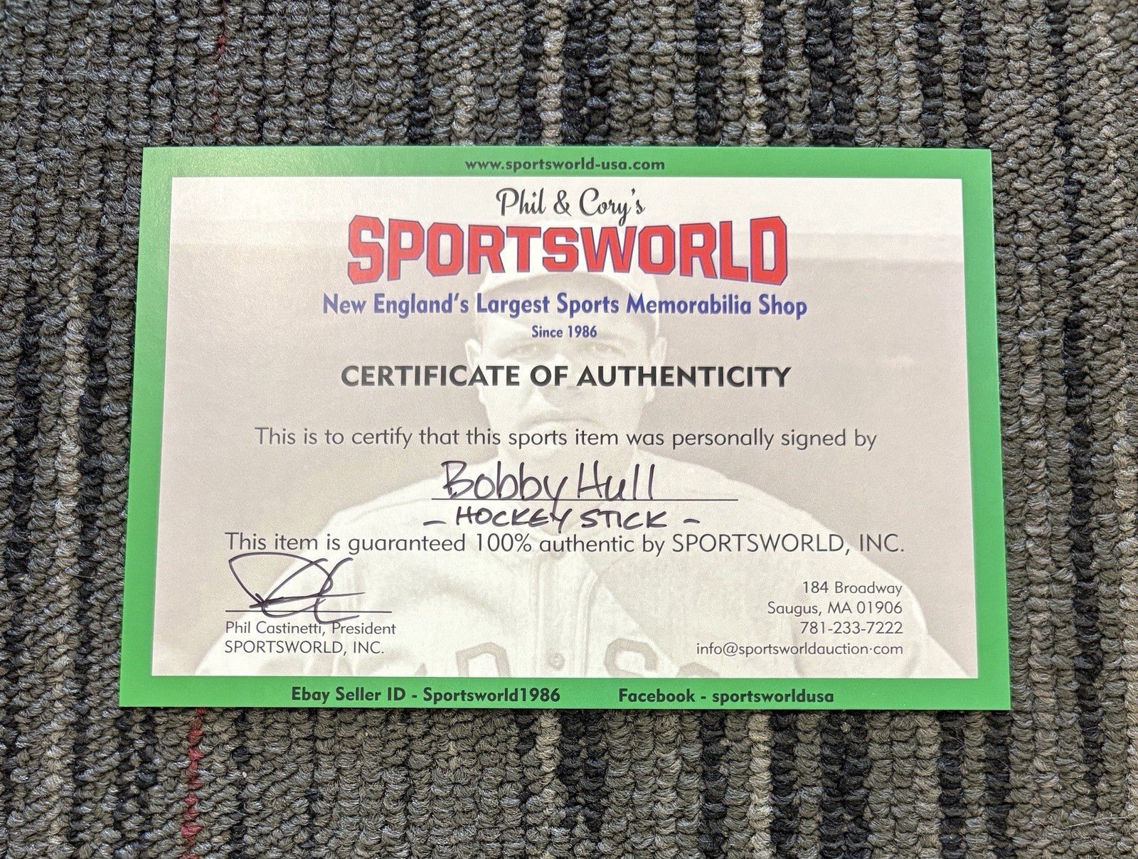 The Bobby Hull signed stick is a highly collectible item for fans of hockey, specifically the NHL. This original stick bearing the signature of the legendary player adds a unique and personal touch, making it a valuable piece for any sports memorabilia collection. Whether displayed as part of a fan's shrine or as a conversation piece, this signed stick is a must-have for any die-hard hockey enthusiast.