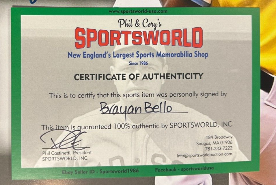 We're offering this Autographed 11x14 Photo of Boston Red Sox Starting Pitcher Brayan Bello. It comes with a COA issued by Sportsworld, New England's Largest Sports Memorabilia Store and the signatures are guaranteed to be 100% authentic. We will combine shipping.