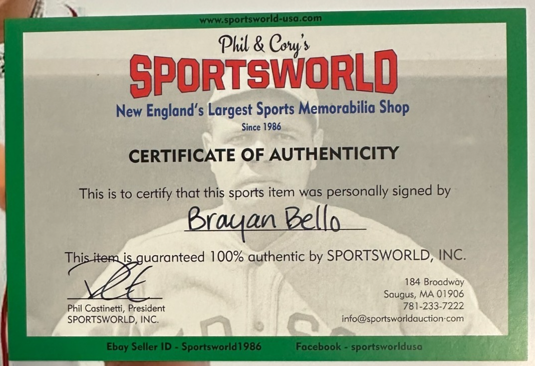 We're offering this Autographed 11x14 Photo of Boston Red Sox Starting Pitcher Brayan Bello. It comes with a COA issued by Sportsworld, New England's Largest Sports Memorabilia Store and the signatures are guaranteed to be 100% authentic. We will combine shipping.