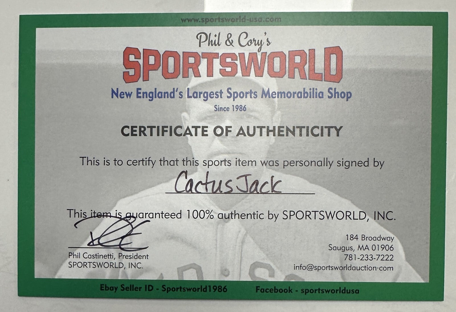We're offering this 16x20 photo autographed & inscribed with "Bang Bang" by Legendary WWE/WWF Superstar Cactus Jack. It's in perfect condition and comes with a COA issued by Sportsworld in Saugus, MA, New England's Largest Sports Memorabilia Store. It's in perfect condition, it will be shipped in a protective plastic holder, and we will combine on shipping for multiple items.