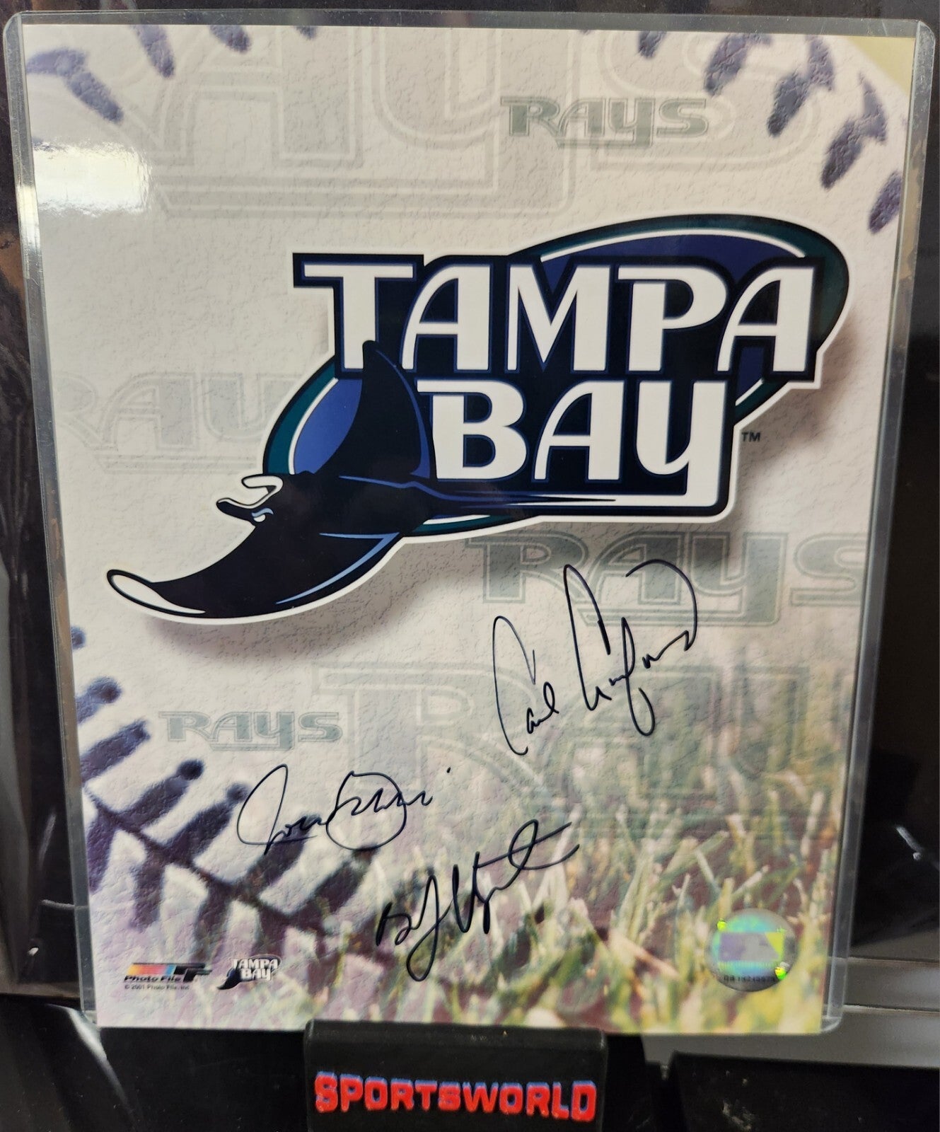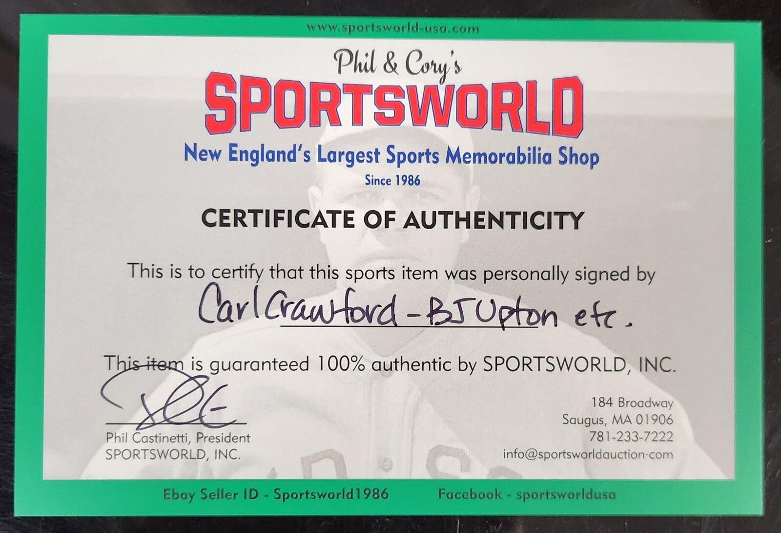 This is an incredible 8x10 photo signed by Carl Crawford, BJ Upton, and one other player from the Tampa Bay Rays. The photo is an original product with a COA, ensuring its authenticity. It features the team's stars and is perfect for any fan or collector who loves baseball.