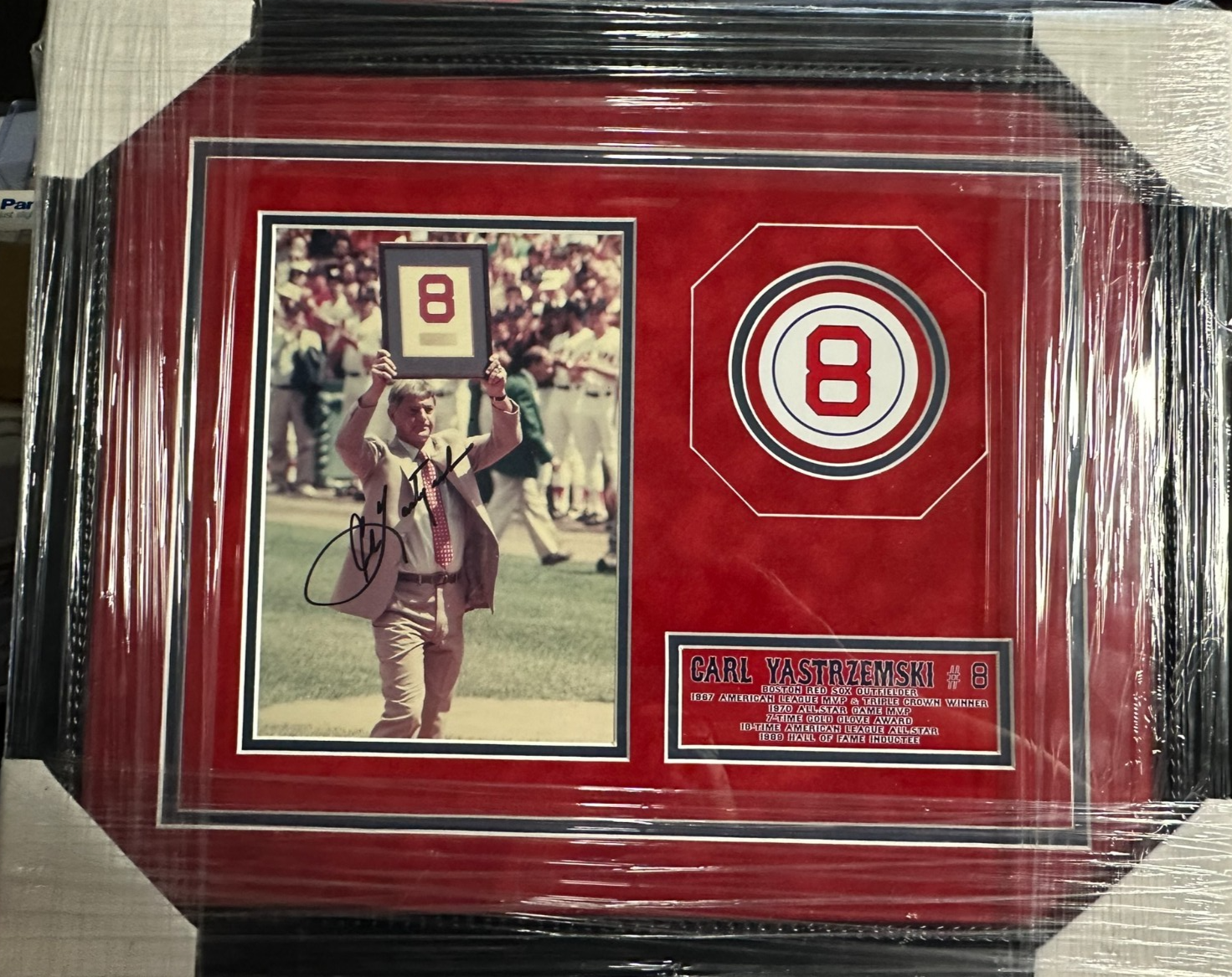 We're offering this 8x10 Photo of Hall of Fame Outfielder Carl Yastrzemski Holding Up his Number on the day the Red Sox retired is Jersey #. It's beautifully matted & framed. It comes with a COA Issued by Sportsworld, New England's Largest Sports Memorabilia Store and his signature is guaranteed to be 100% Authentic. It measures approx. 20" x 16" and we will combine on shipping for similar items!