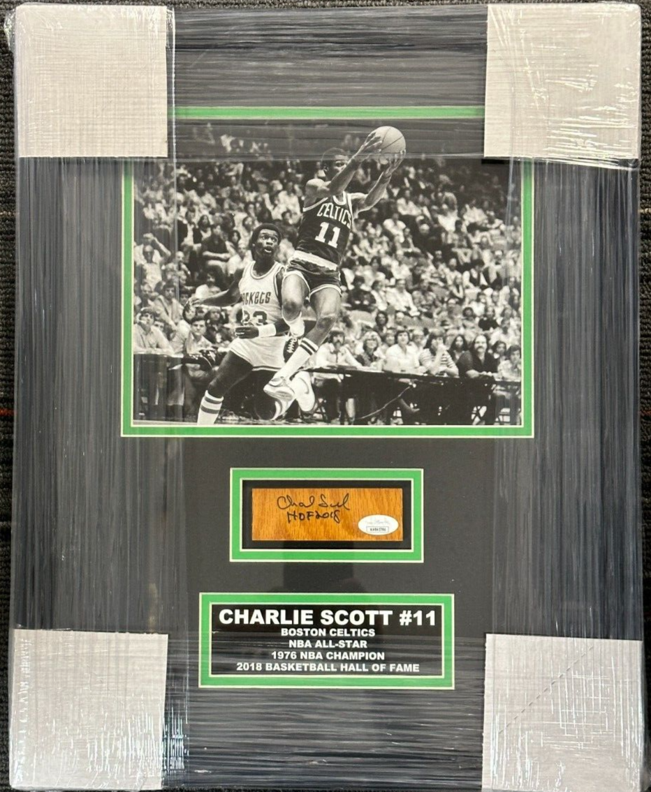 Authentic piece of the Parquet Floor from Boston Garden Autographed by former Basketball Hall of Famer Charlie Scott. It's beautifully matted & framed along with an 8x10 photo. It comes with a COA & Matching Hologram issued by JSA Authentication (WA845766) and his signature is guaranteed to be 100% authentic, and we will combine on shipping for similar items!