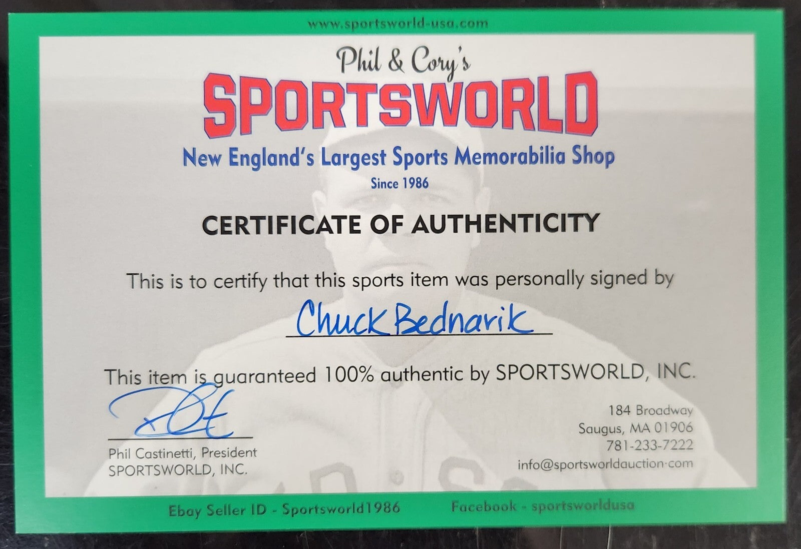 The COA is from Sportsworld- New England's largest sports memorabilia shop. Please refer to our pictures to be sure.