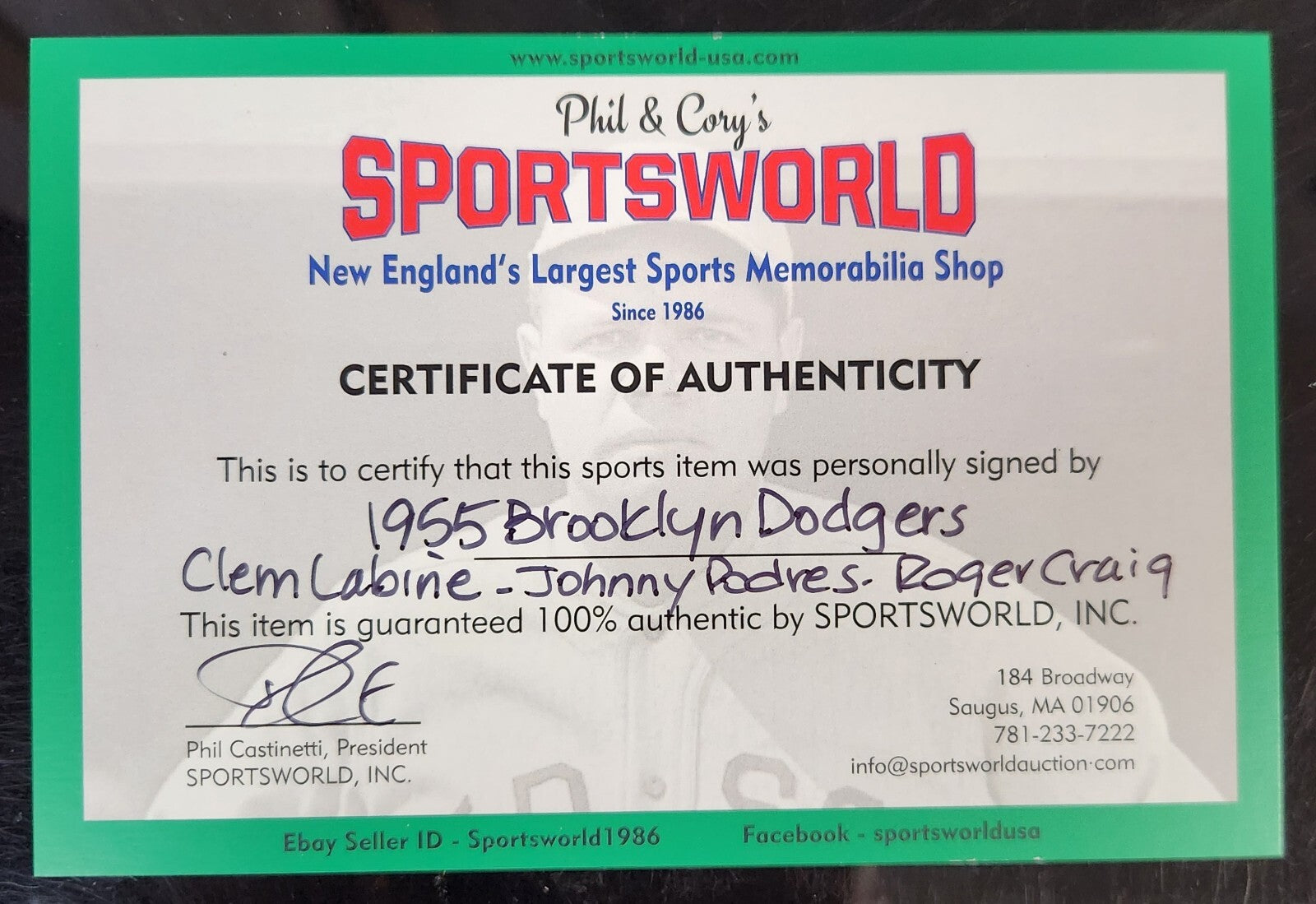 Own a piece of baseball history with this 8x10 photo featuring the legendary Brooklyn Dodgers players Clem Labine, Johnny Podres, and Roger Craig. This original and signed photo captures a moment in time from the 1955 season. This picture is of the World Series game winners! Perfect for any baseball fan or collector, this photo comes with a certificate of authenticity. Whether you're a Dodgers fan or just a lover of the game, this rare item is a must-have for any collection.