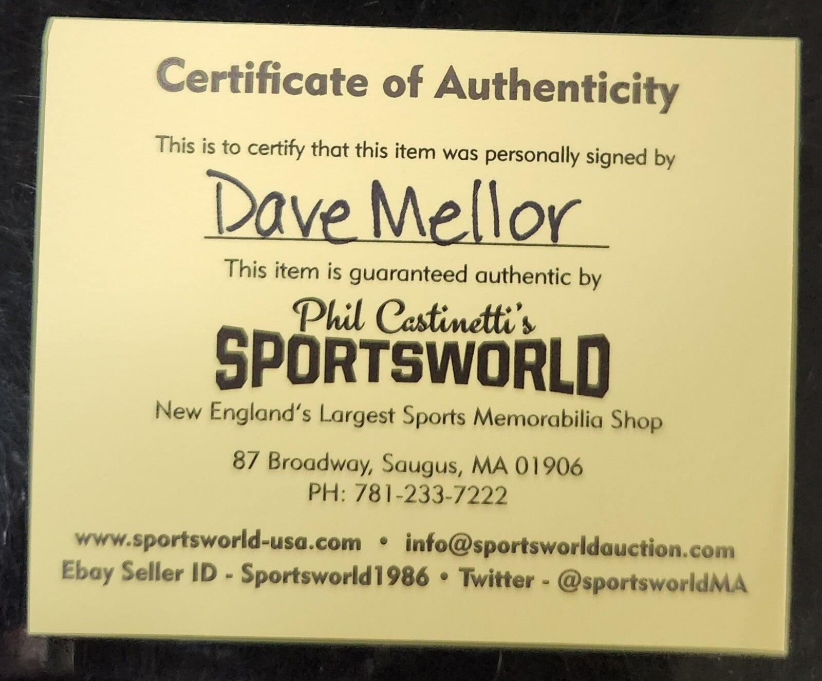 The COA is from Sportsworld- New England's largest sports memorabilia shop. Please refer to our pictures to be sure.