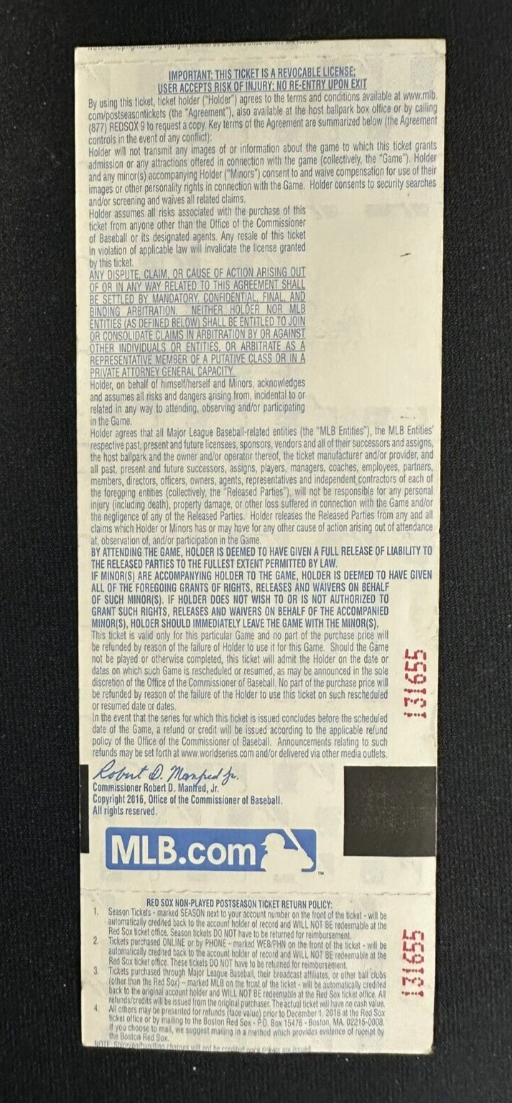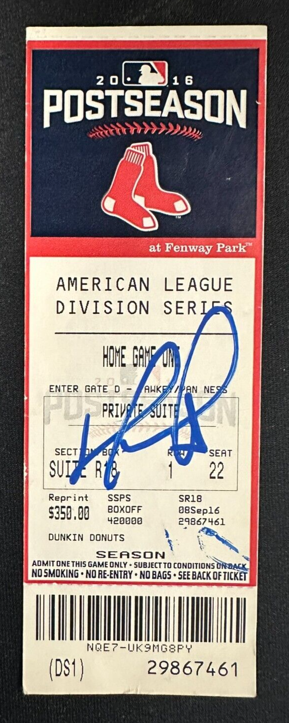 We're offering this ticket from "Big Papi" David Ortiz Final Career Game. Its from game 3 of the 2016 ALDS between the Boston Red Sox & the Cleveland Indians on October 10, 2016 at Fenway Park in Boston. It's in ex condition, it comes with a COA issued by Sportsworld, New England's Largest Sports Memorabilia Shop and his signature is guaranteed to be 100% authentic.