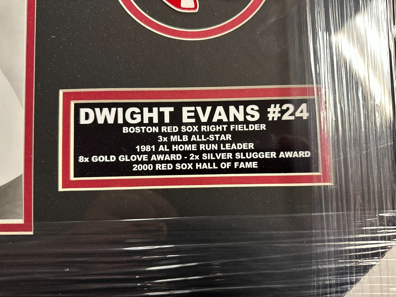 We're offering this 8x10 Photo of All-Star Outfielder "Dewey" Dwight Evans of the Boston Red Sox. It's beautifully matted & framed. It comes with a COA Issued by Sportsworld; New England's Largest Sports Memorabilia Store and his signature is guaranteed to be 100% Authentic. It measures approx. 20" x 16", and we will combine on shipping for similar items!