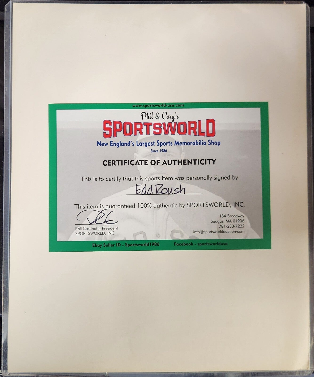 Ideal for any avid sports memorabilia enthusiast, this original photo showcases Roush in mid-action, encapsulating his remarkable career. Whether it's for your personal collection, a display in your home or office, or a thoughtful gift for a fellow baseball aficionado, this signed photo is a timeless tribute to the sport and its storied players.