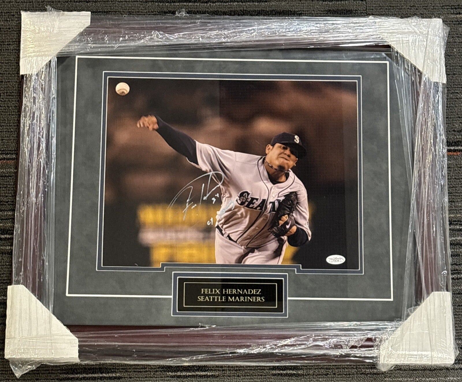 The product is a framed 11x14 photo of baseball player Felix Hernandez, who played for the Seattle Mariners. The photo is signed by Hernandez and includes a Cy Young inscription, indicating an award he received for being the best pitcher in the league. The autograph on the photo has been authenticated by James Spence Authentication (JSA), ensuring its authenticity as an original signed piece. This unique item would make a valuable addition to any baseball memorabilia collection.