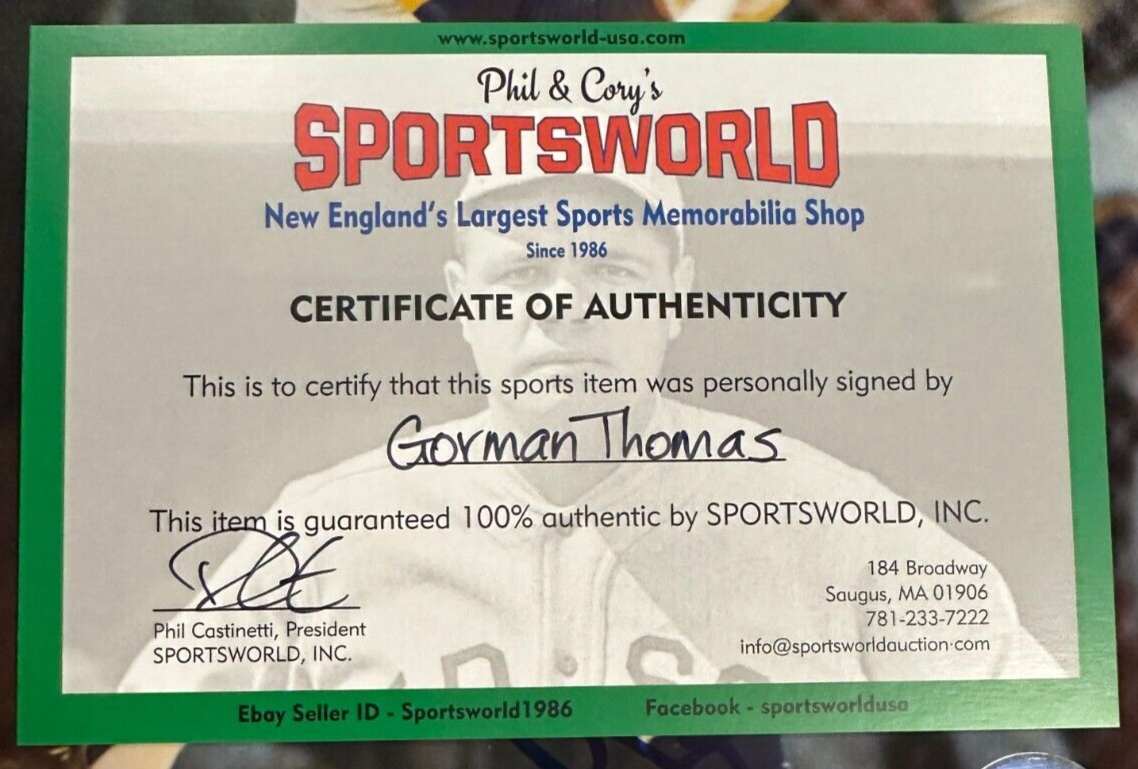 We're offering this 8x10 Photo autographed by former Milwaukee Brewers All-Star Slugger Gorman Thomas. It comes with a COA Issued by Sportsworld, New England's Largest Sports Memorabilia Store and his signature is guaranteed to be 100% authentic. The photo is in excellent condition, and we will combine on shipping for similar items!