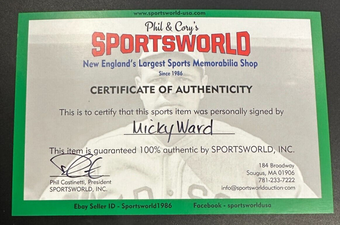 We're offering this Autographed 16" x 20" photo from the Irish Micky Ward Vs. Arturo Gatti Fight. It's in perfect condition, it comes with a COA Issued by Sportsworld New England's Largest Sports Memorabilia Store and was signed by Micky during a public signing at our store on 11/10/2024. We will combine on shipping for similar items!