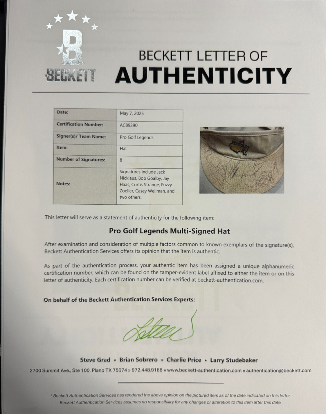 We're offering this Golf Visor from The Masters Autographed by PGA Legends Jack Nicklaus, Fuzzy Zoeller, Jay Haas, Curtis Strange, Bob Goalby, Casey Wellman & 2 others. It's in excellent condition and it comes with a Full Letter LOA and Matching Hologram issued by BAS (AC89390) Beckett Authentication Services and all signatures are guaranteed to be 100% authentic. We will combine on shipping for similar items!