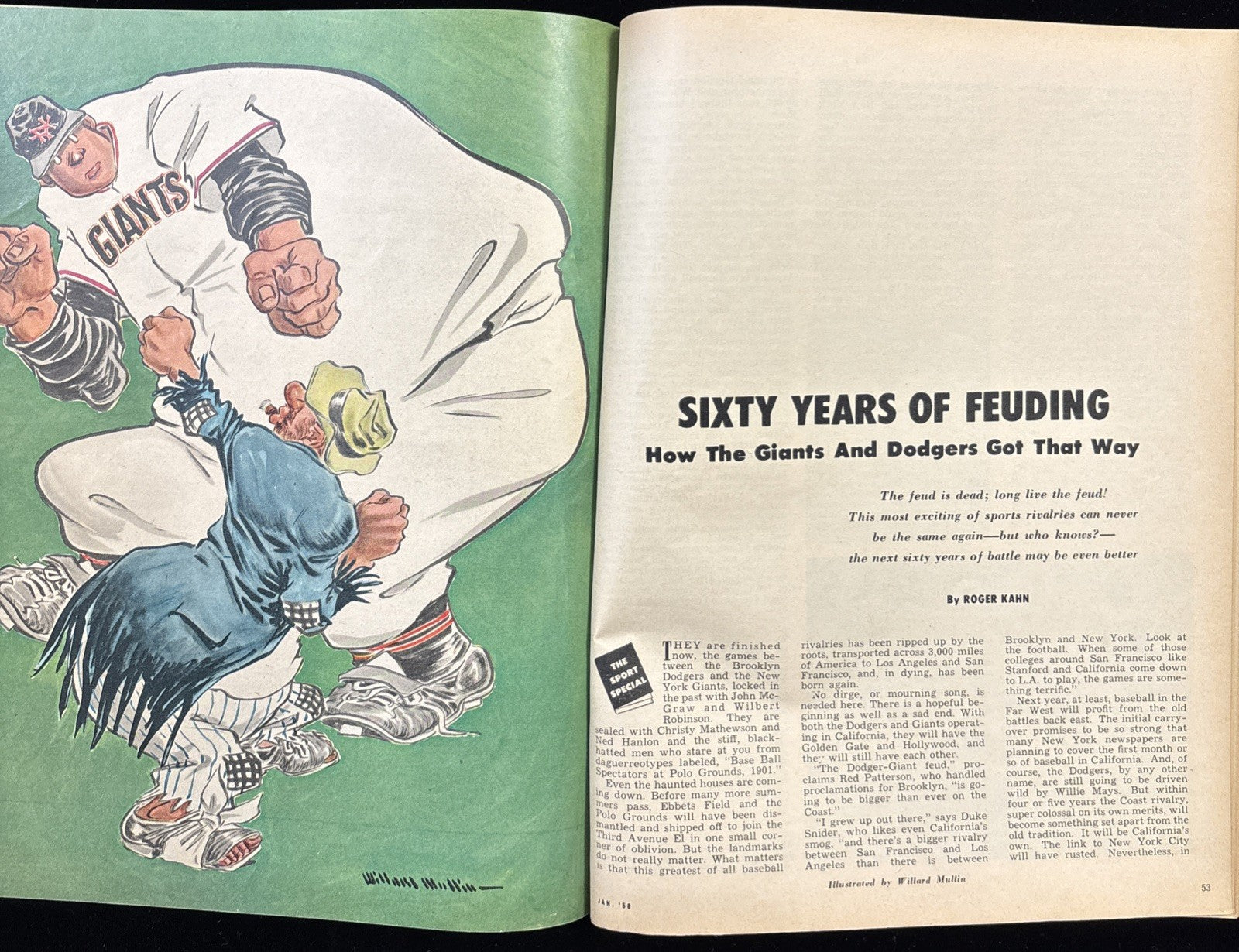 The product is an original January 1958 Sport Magazine featuring baseball stars Jackie Robinson and Willie Mays on the cover. This vintage magazine is a rare find, showcasing the two iconic players who had a significant impact on the baseball world. Representing teams like the Brooklyn Dodgers and San Francisco Giants, this piece of sports memorabilia from 1958 captures a moment in baseball history that is cherished by fans and collectors alike.** Binder shows wear**